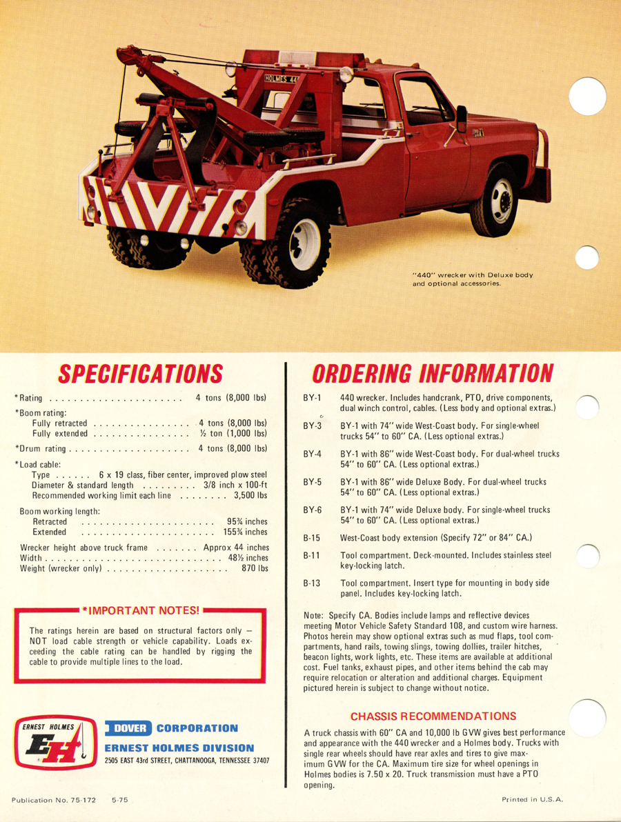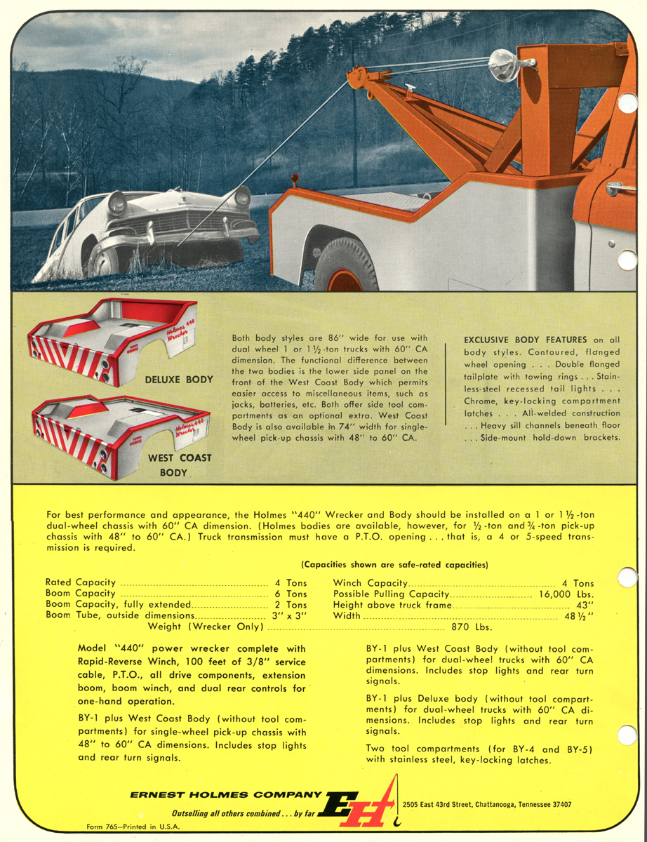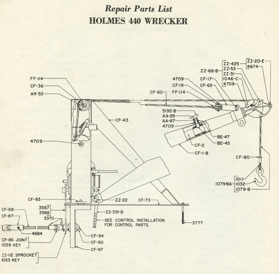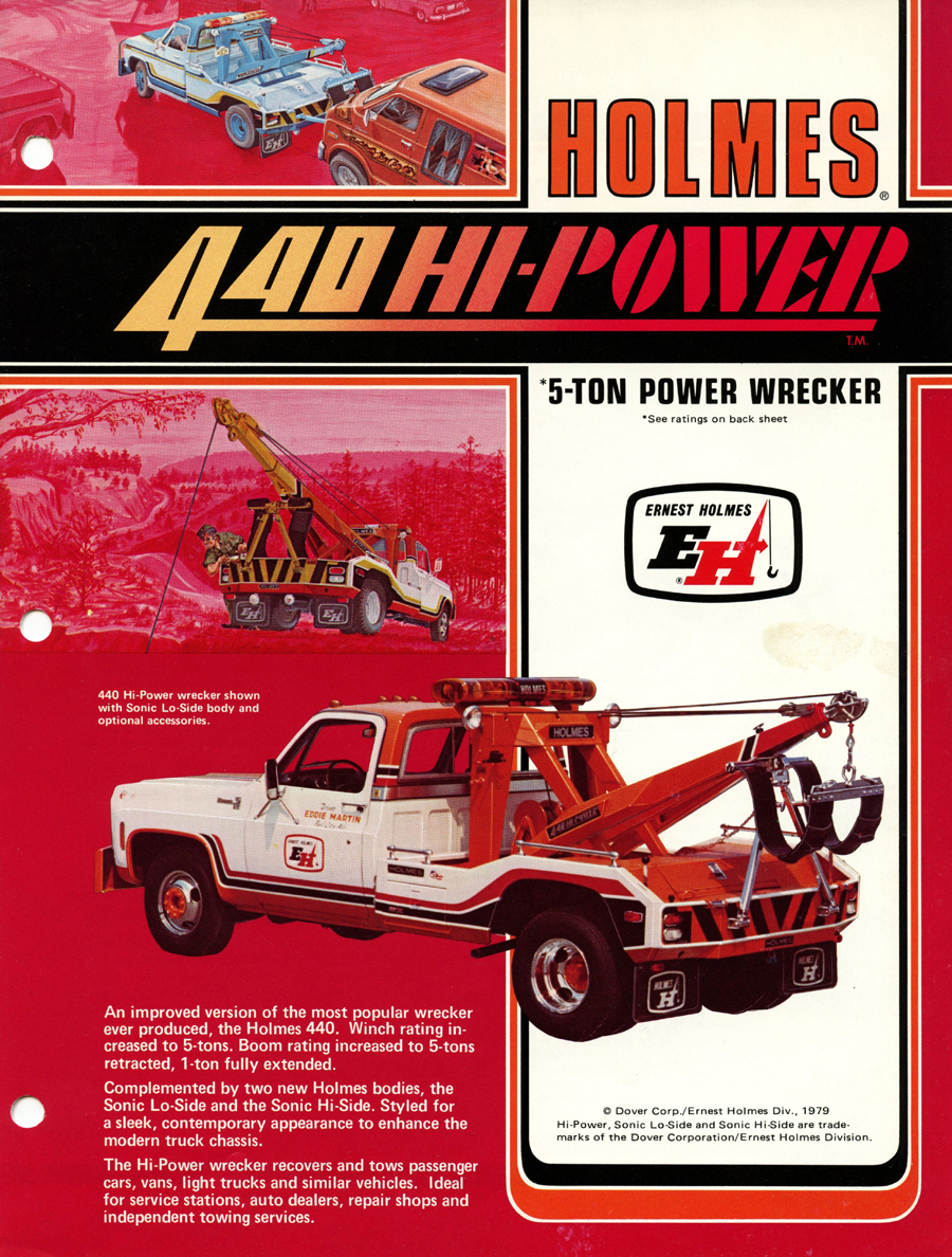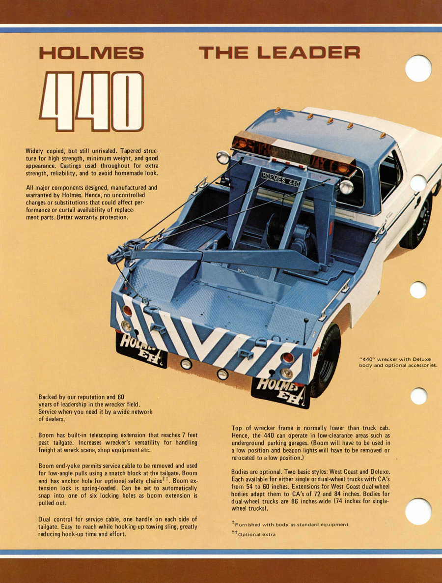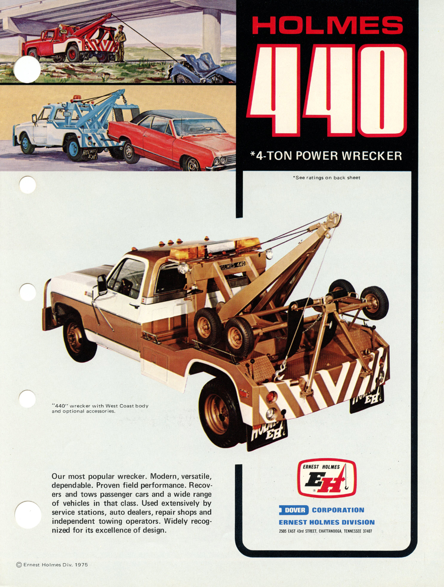 HOLMES 440 In the late 50’s and early 60’s Holmes was marketing the 400 and 400 RW wreckers to service stations; and they developed the new Holmes 440 for this market. Moving away from channel and angle iron frames the 440 offered a stylish formed steel head frame and body assembly with an extendable boom center section. The first 440 was serial # A66CF – 101 and was shipped Jan 11, 1966 – all 440’s had “CF” as the ID code; 440 Hi Power were coded “CFH” and the rare factory hydraulic units had “HYD” at the end of the serial number.