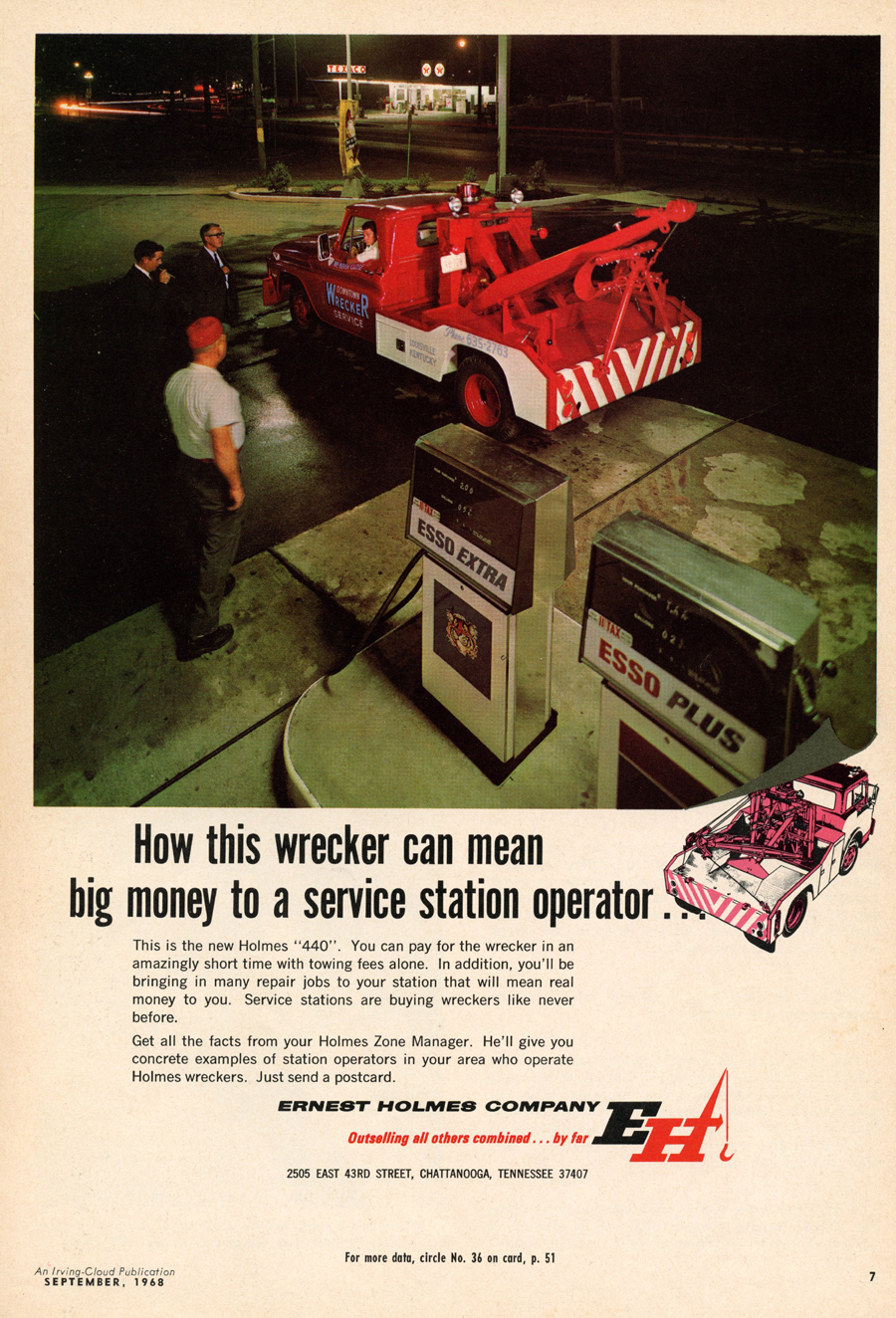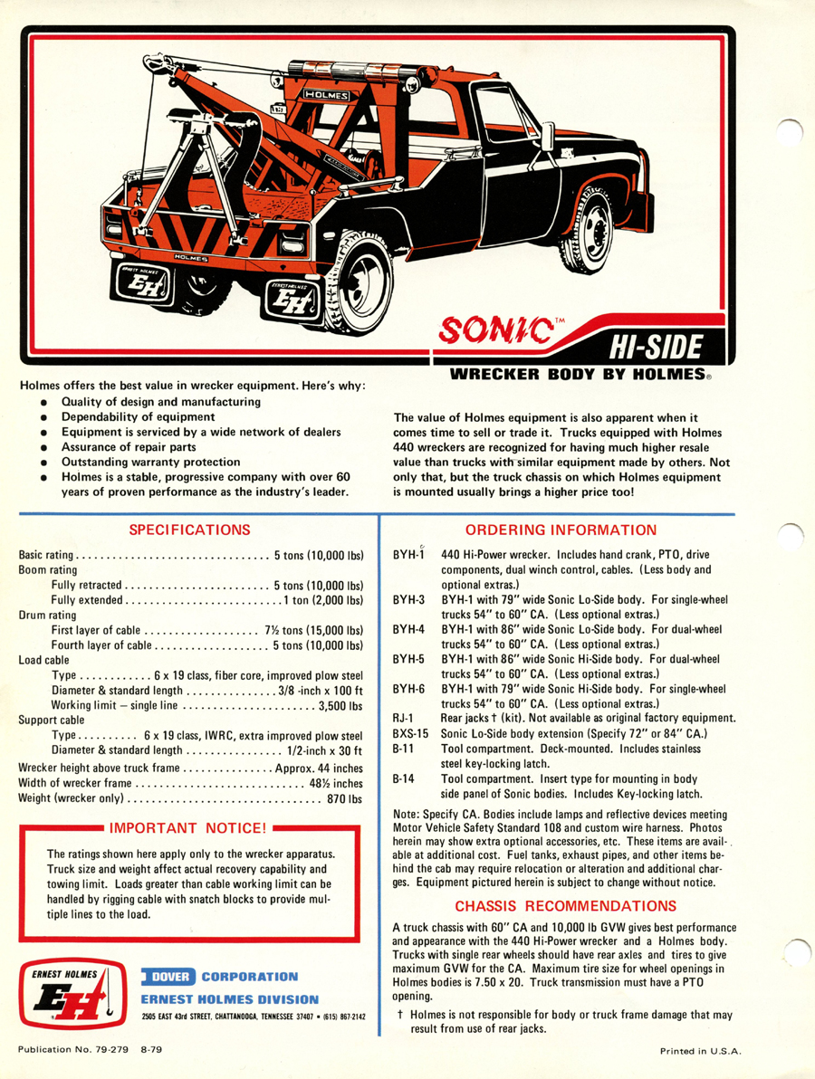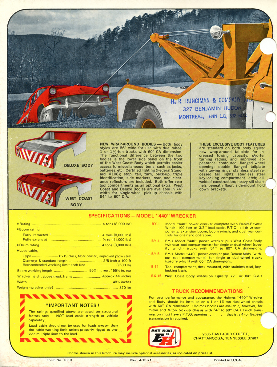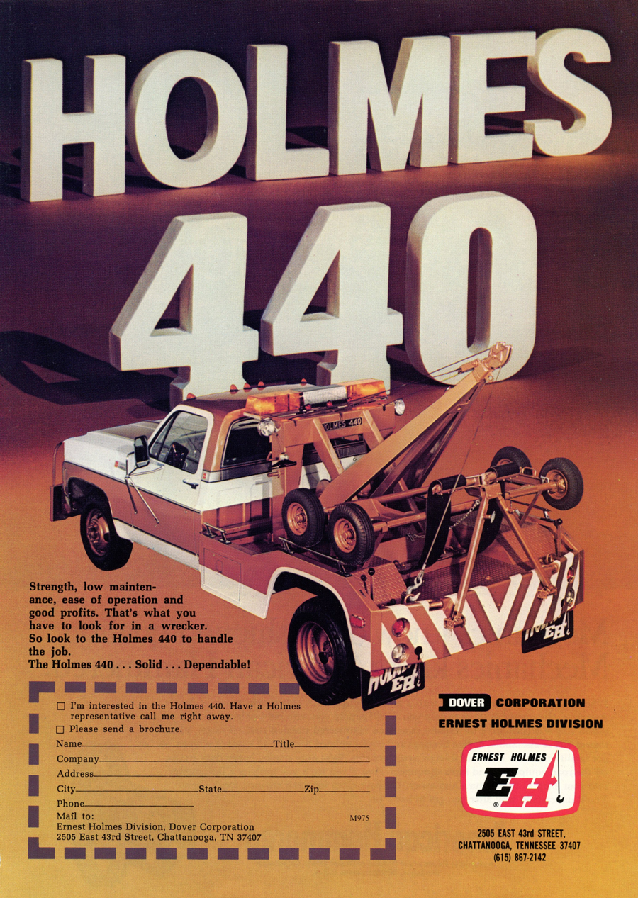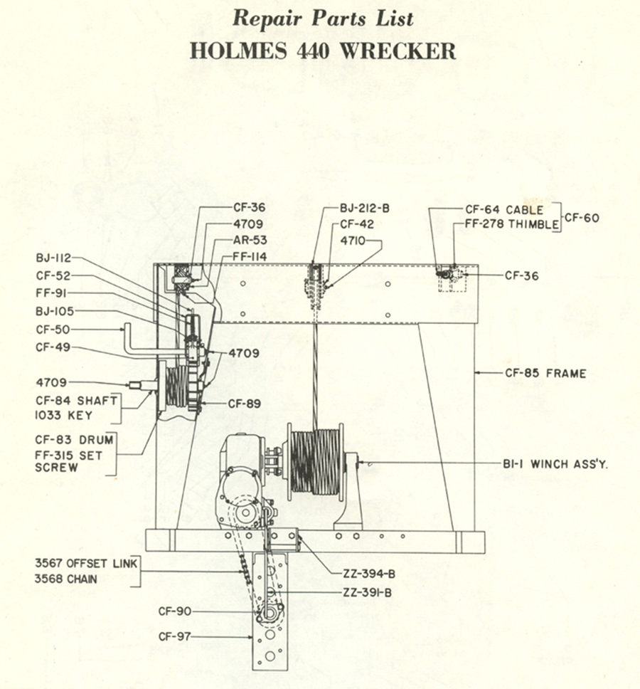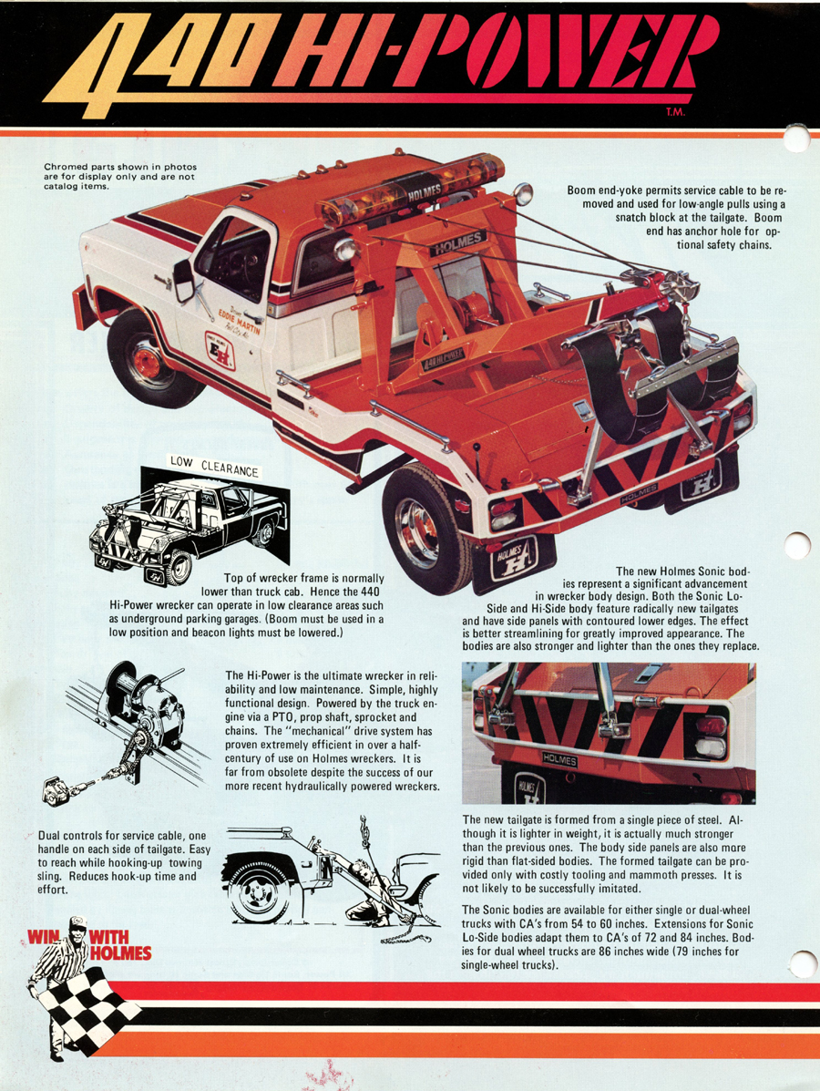 HOLMES 440 In the late 50’s and early 60’s Holmes was marketing the 400 and 400 RW wreckers to service stations; and they developed the new Holmes 440 for this market. Moving away from channel and angle iron frames the 440 offered a stylish formed steel head frame and body assembly with an extendable boom center section. The first 440 was serial # A66CF – 101 and was shipped Jan 11, 1966 – all 440’s had “CF” as the ID code; 440 Hi Power were coded “CFH” and the rare factory hydraulic units had “HYD” at the end of the serial number.