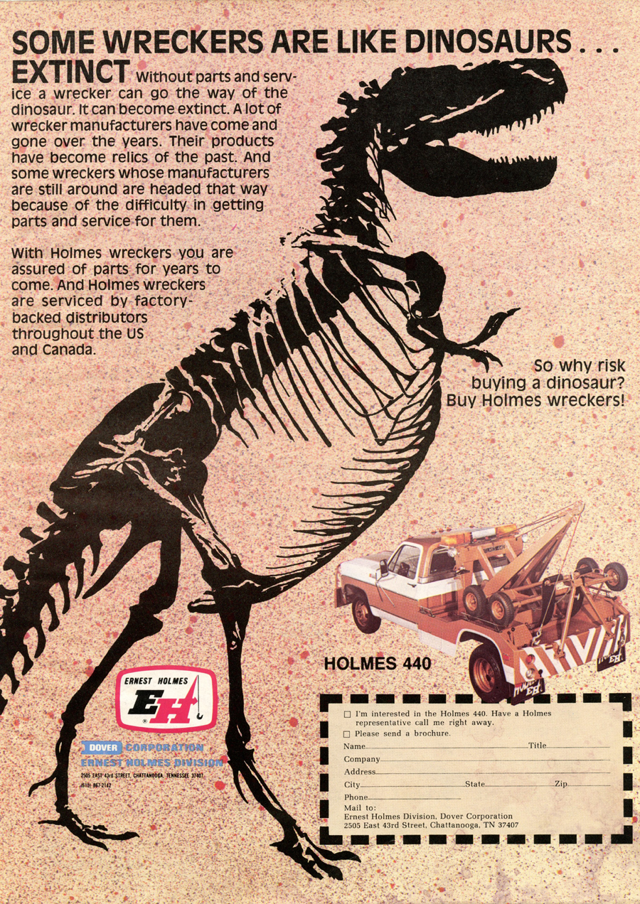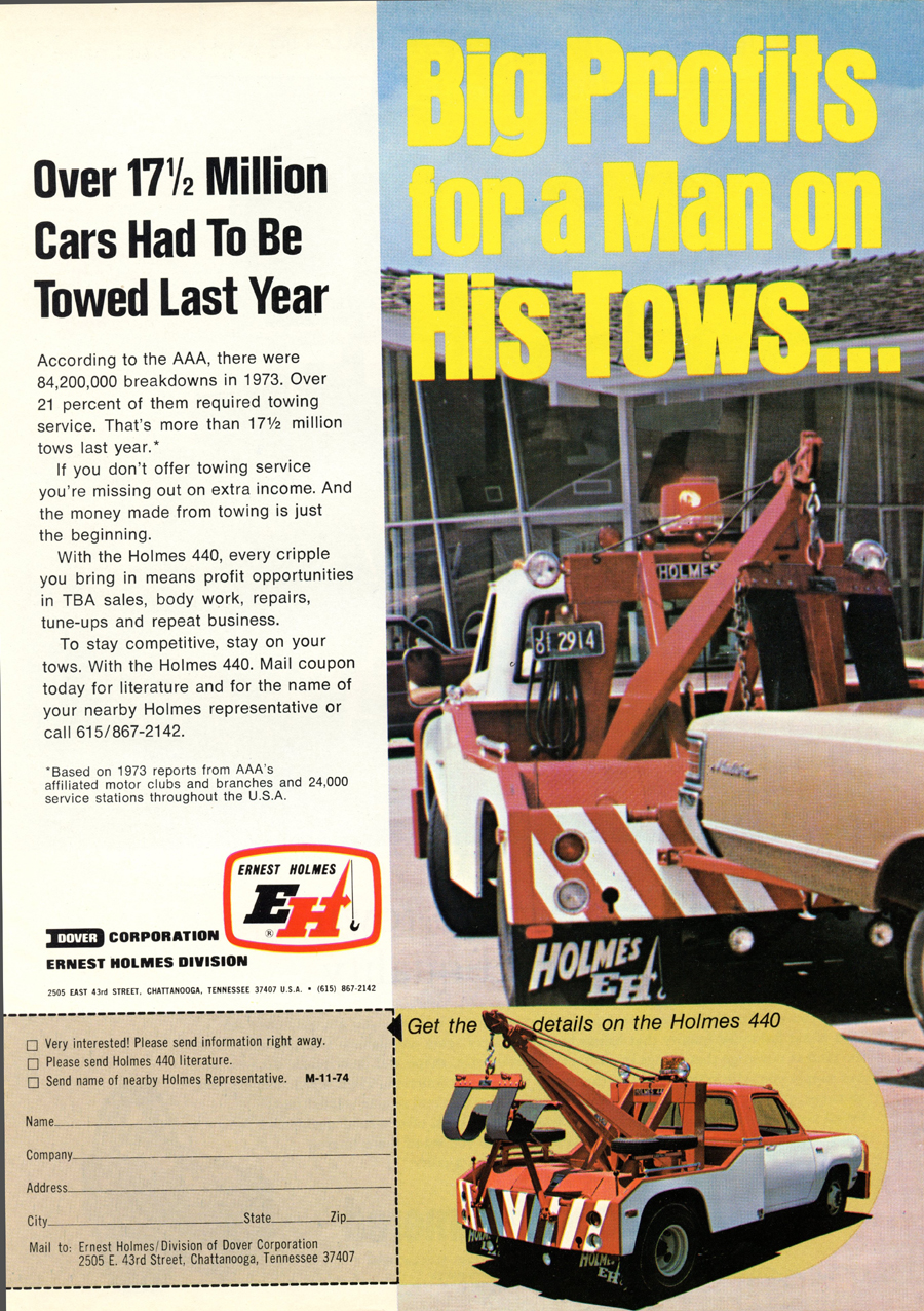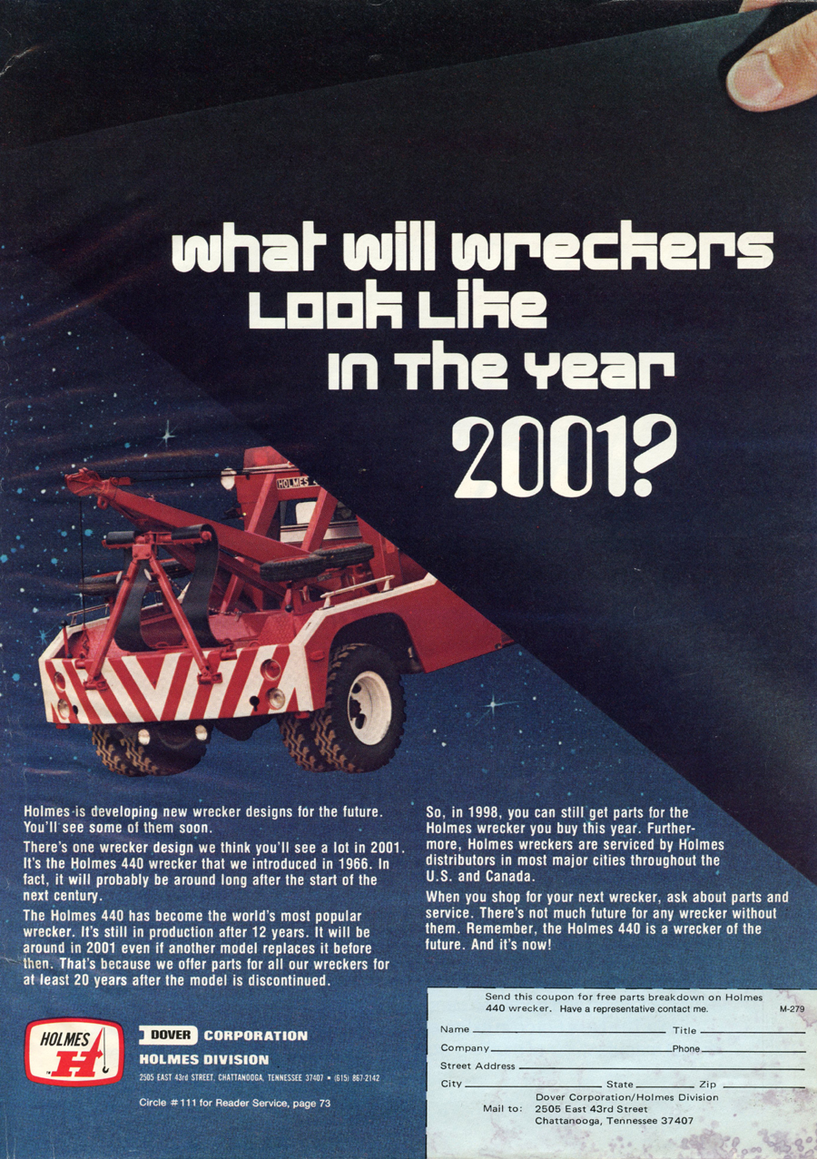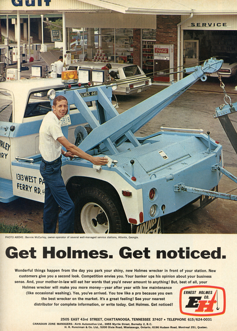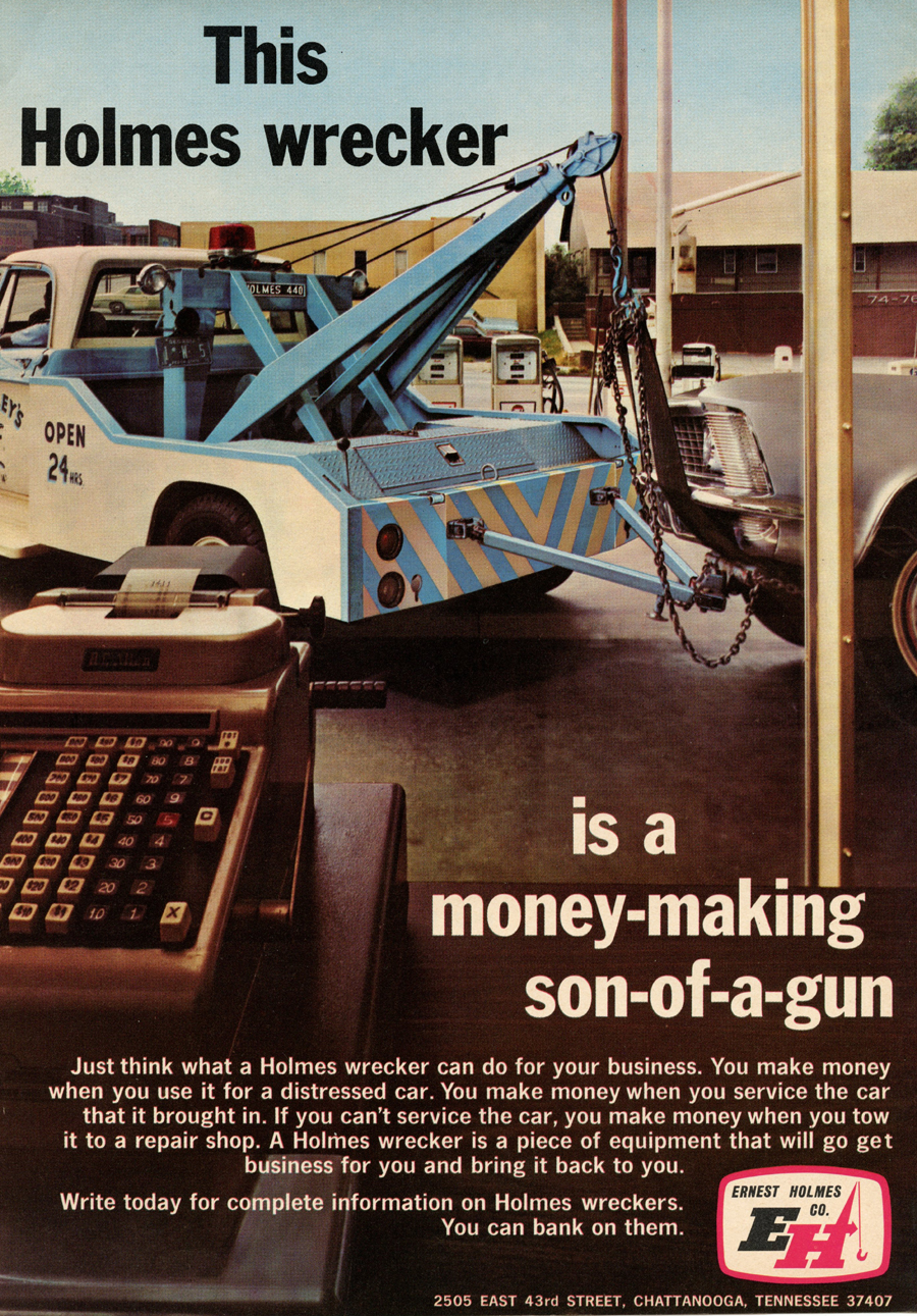 HOLMES 440 In the late 50’s and early 60’s Holmes was marketing the 400 and 400 RW wreckers to service stations; and they developed the new Holmes 440 for this market. Moving away from channel and angle iron frames the 440 offered a stylish formed steel head frame and body assembly with an extendable boom center section. The first 440 was serial # A66CF – 101 and was shipped Jan 11, 1966 – all 440’s had “CF” as the ID code; 440 Hi Power were coded “CFH” and the rare factory hydraulic units had “HYD” at the end of the serial number.