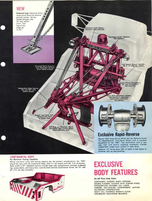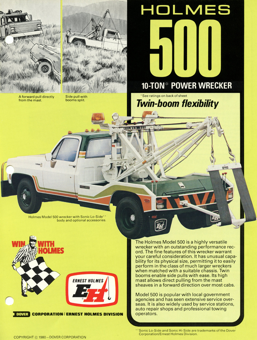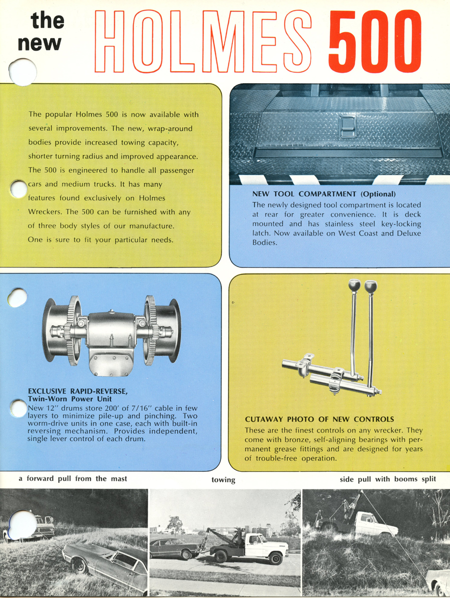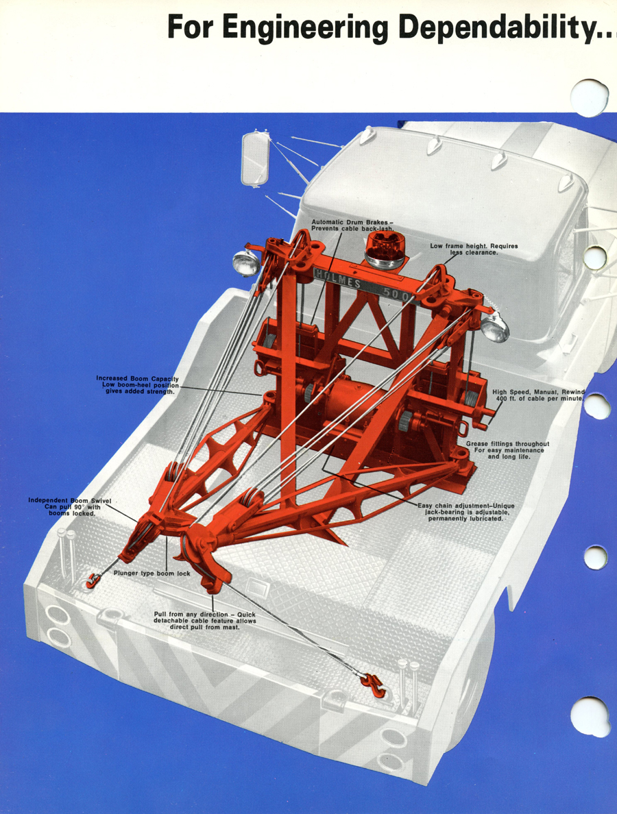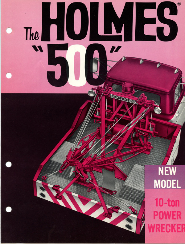Holmes 500 The first Holmes 500 was shipped October 1962 and it was still listed in the 1989 catalog. About 5000 units were shipped; early versions had the square tail gate and side controls. Available options were outboard legs similar to the 600; larger 15” winch drums and a special “Town and Country” model came with one large (15”) and one small (8”) drum. Later units came standard with dual 12” drums and deck mounted control levers with an angled tail gate. There was also a “500 M” version for the military. It was the smallest of the 500 / 600 / 750 series that all used the same double reduction gearbox with rapid reverse. It was often installed on a 1 ton chassis but was best suited to the 2-3 ton chassis so that the operator could take full advantage of its 10 ton pulling power.