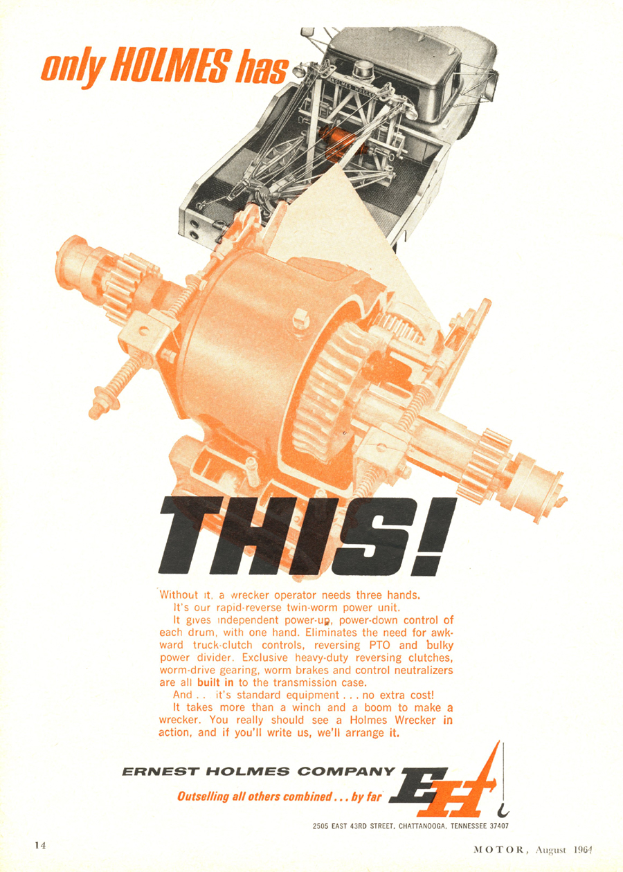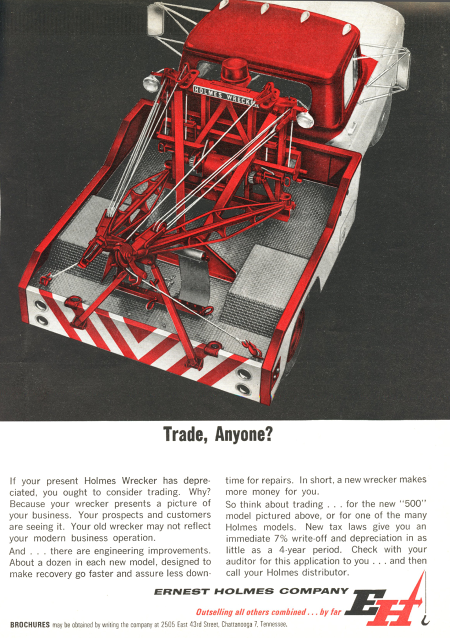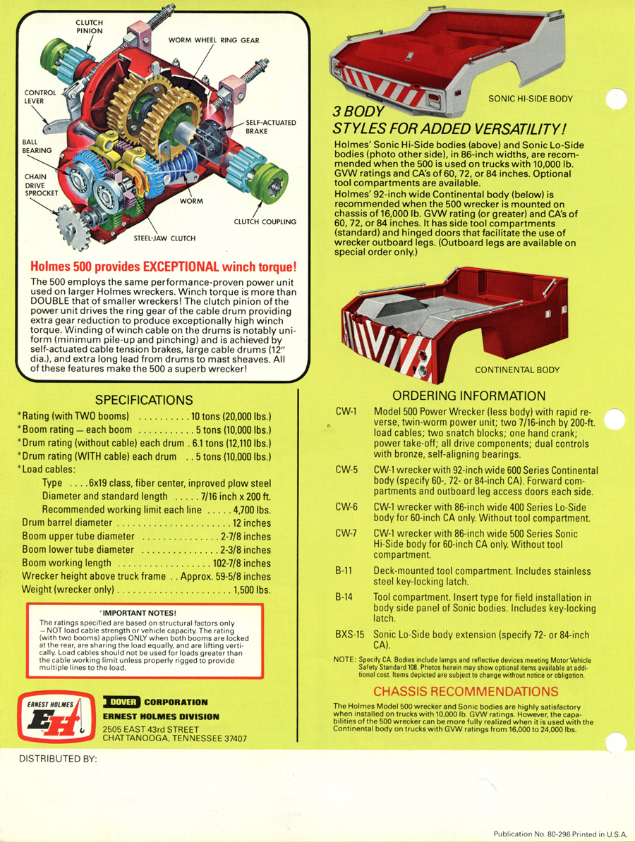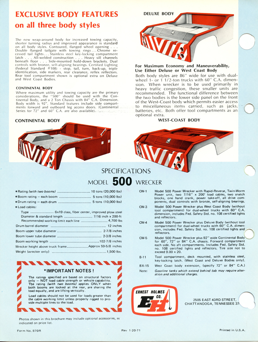Holmes 500 The first Holmes 500 was shipped October 1962 and it was still listed in the 1989 catalog. About 5000 units were shipped; early versions had the square tail gate and side controls. Available options were outboard legs similar to the 600; larger 15” winch drums and a special “Town and Country” model came with one large (15”) and one small (8”) drum. Later units came standard with dual 12” drums and deck mounted control levers with an angled tail gate. There was also a “500 M” version for the military. It was the smallest of the 500 / 600 / 750 series that all used the same double reduction gearbox with rapid reverse. It was often installed on a 1 ton chassis but was best suited to the 2-3 ton chassis so that the operator could take full advantage of its 10 ton pulling power.