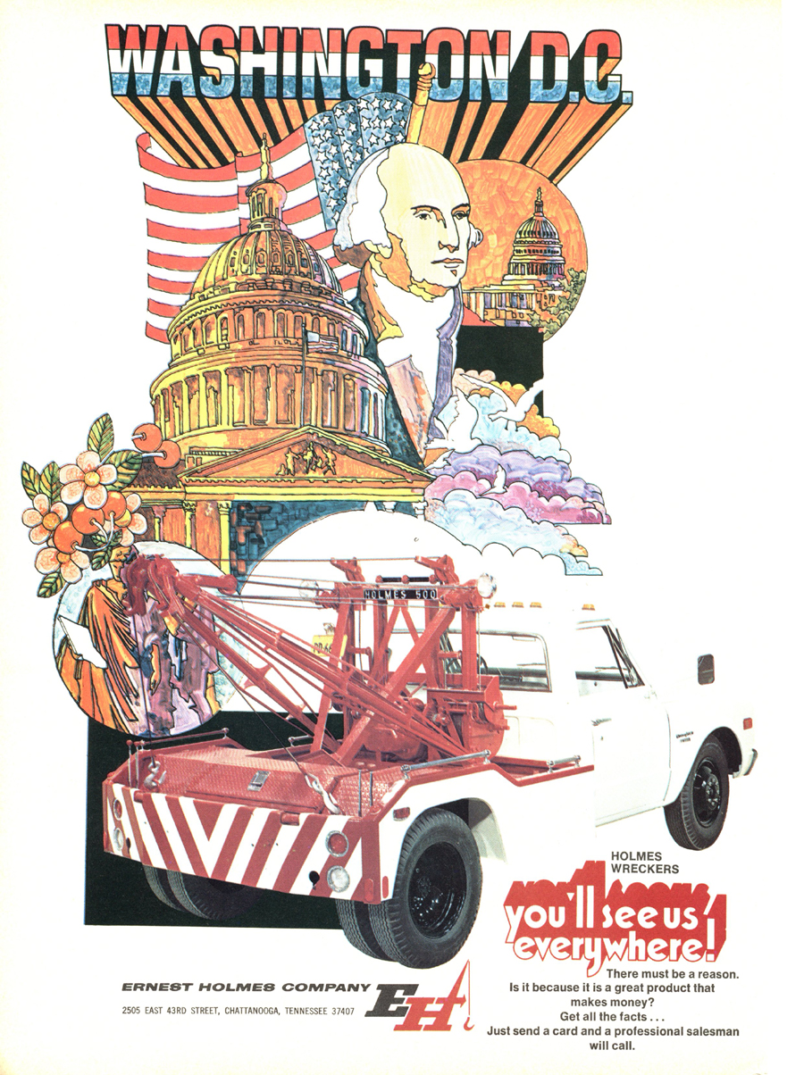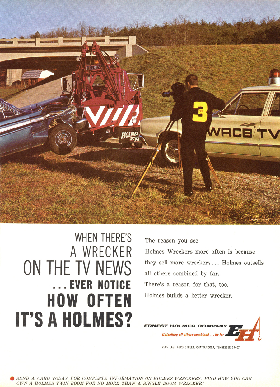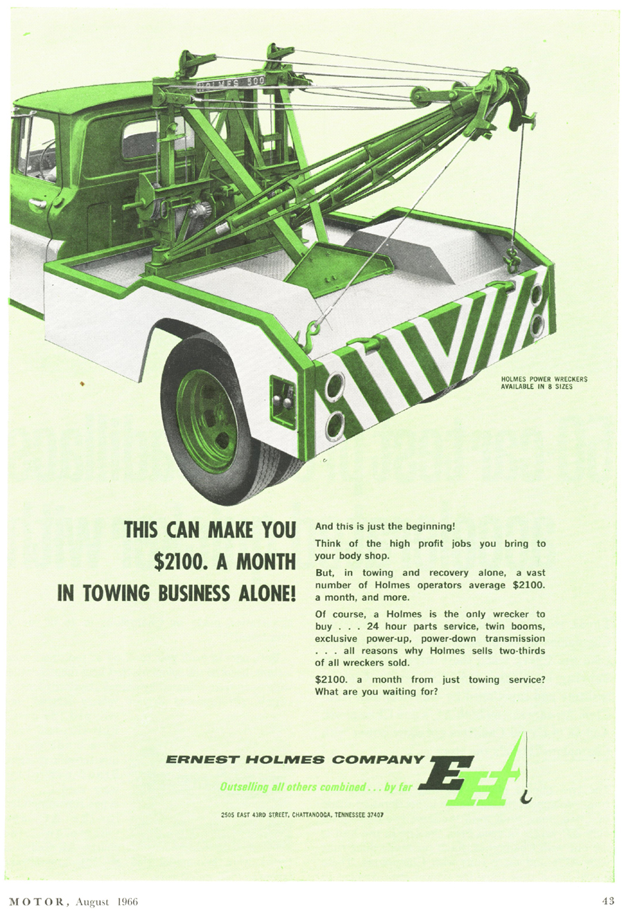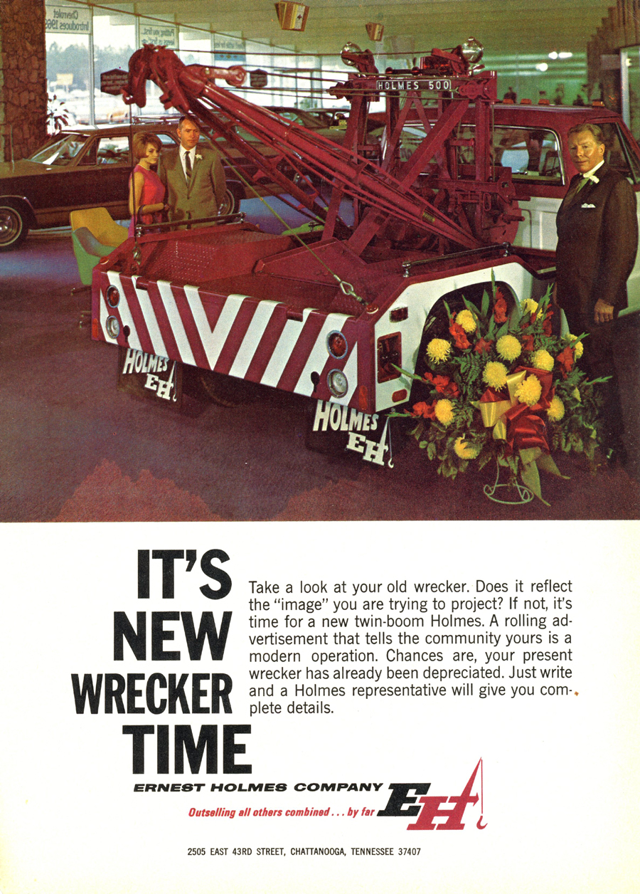 Holmes 500 The first Holmes 500 was shipped October 1962 and it was still listed in the 1989 catalog. About 5000 units were shipped; early versions had the square tail gate and side controls. Available options were outboard legs similar to the 600; larger 15” winch drums and a special “Town and Country” model came with one large (15”) and one small (8”) drum. Later units came standard with dual 12” drums and deck mounted control levers with an angled tail gate. There was also a “500 M” version for the military. It was the smallest of the 500 / 600 / 750 series that all used the same double reduction gearbox with rapid reverse. It was often installed on a 1 ton chassis but was best suited to the 2-3 ton chassis so that the operator could take full advantage of its 10 ton pulling power.