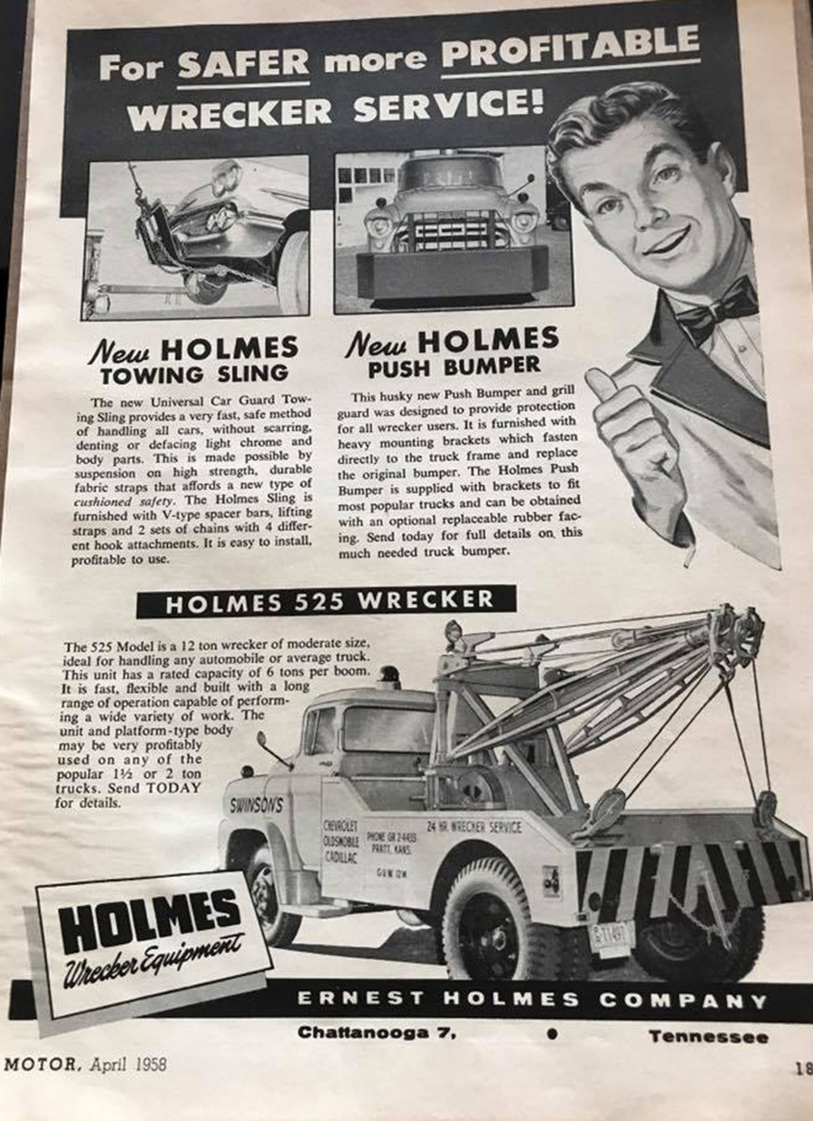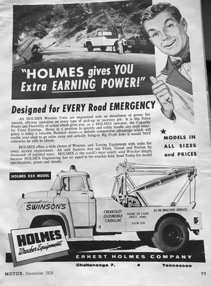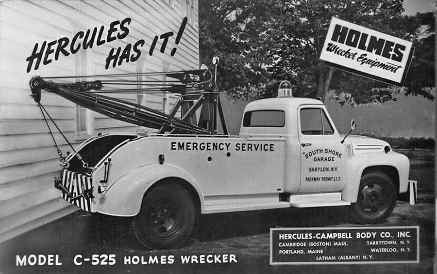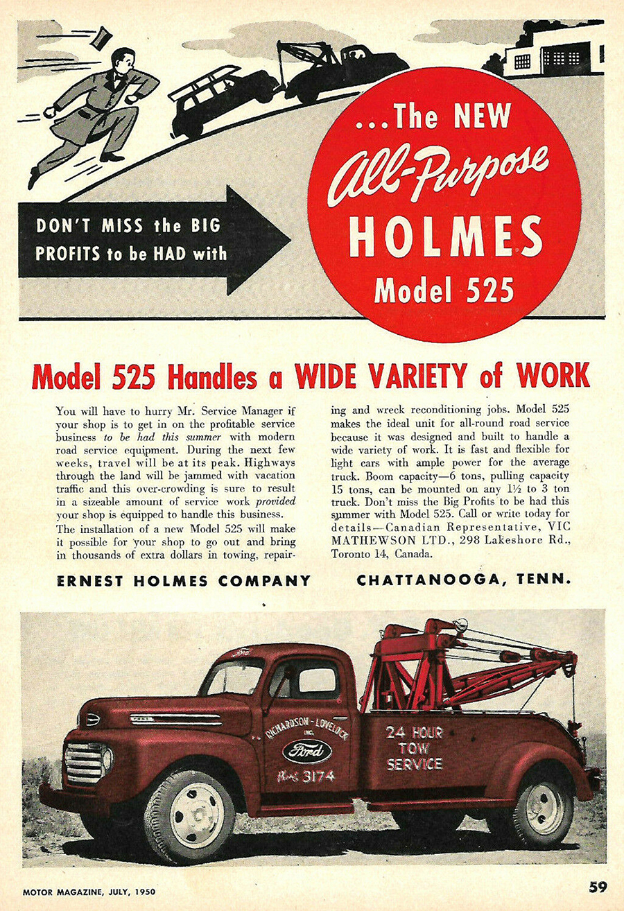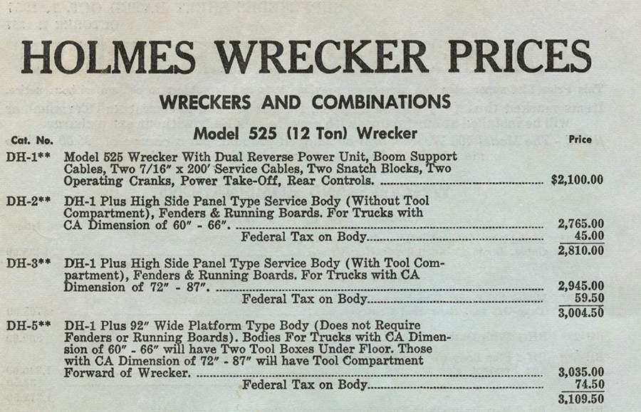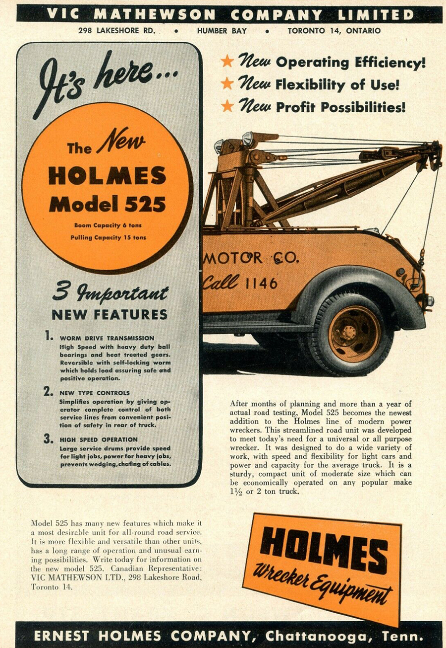 Holmes 525 The 12 ton (model code “FA”) 525 wrecker was built from January 1950 to May 1963, with a total of 3540 units built. It replaced the W35 model that had been in production since 1931. With large (20”) drums and a capacity of 250 ft of 7/16th cable on each drum as well as outrigger legs it is a versatile medium recovery wrecker. Available with the traditional panel type body or the new platform body that was to carry through to the last of the mechanical wreckers. There are still model 525 wreckers operating as recovery units today – a testimony to the durability and excellent design of this wrecker.