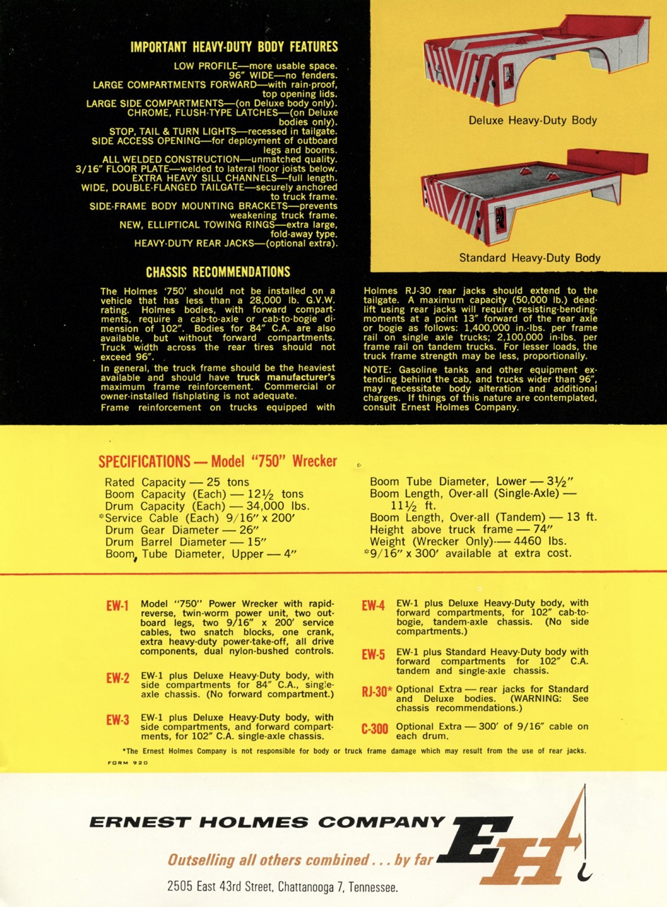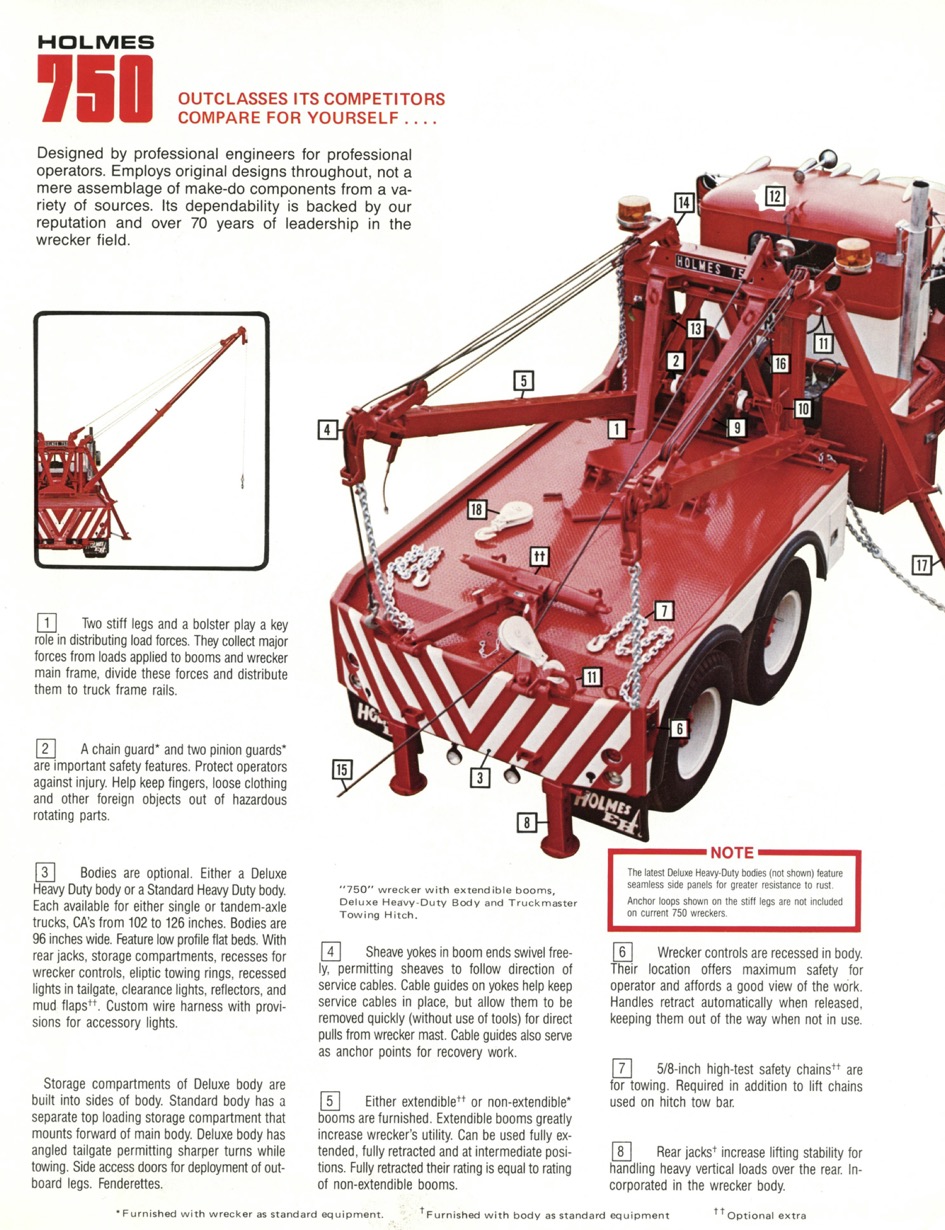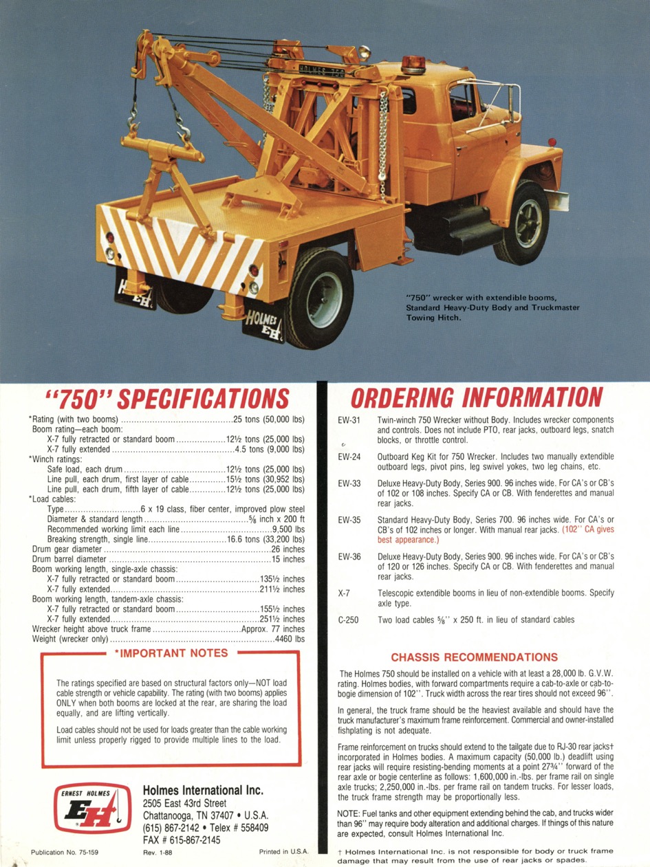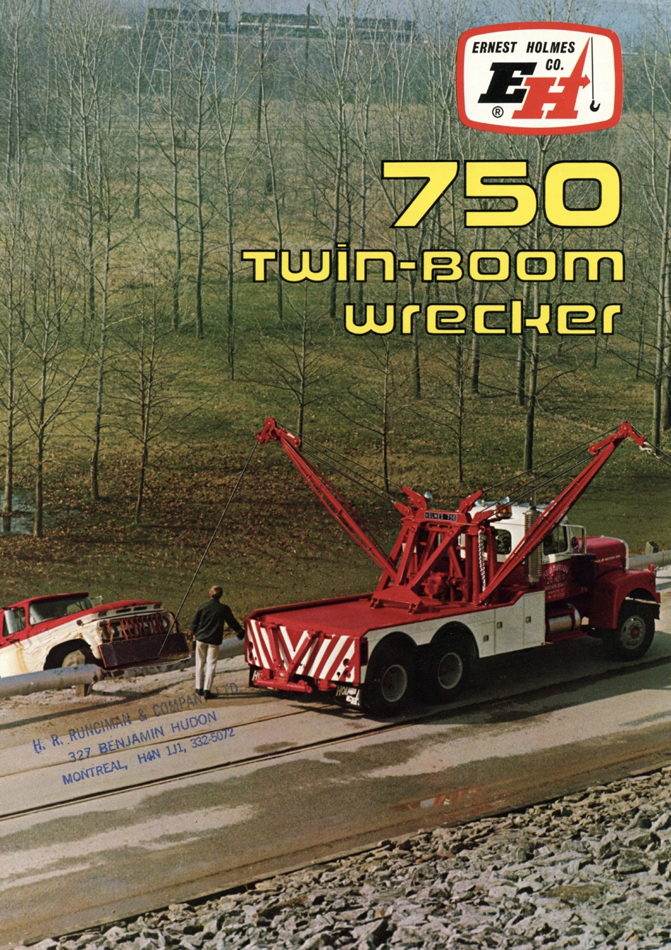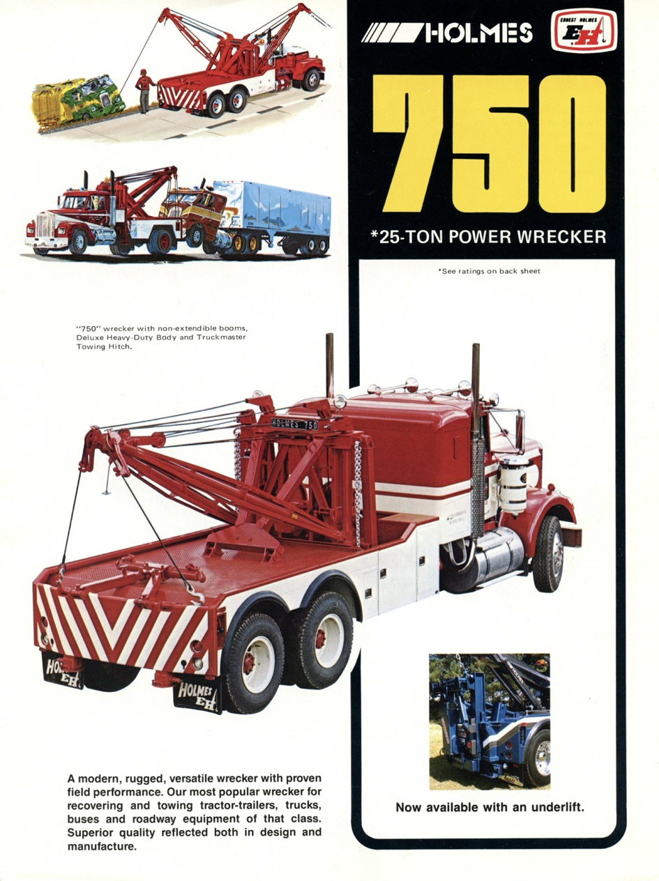 Holmes 750 The Holmes 750 25 Ton Twin Boom mechanical wrecker was targeted at medium and heavy duty towing and recovery. The first unit was shipped in September of 1962 and production continued until 1990: about 7000 units were built during a 28 year production run. Units were offered with standard or extending booms that could be specified in different lengths for single axle or tandem trucks. Outriggers were standard equipment and side mount controls were used on all versions. Deluxe bodies with toolboxes were available as was a durable military spec standard body. |