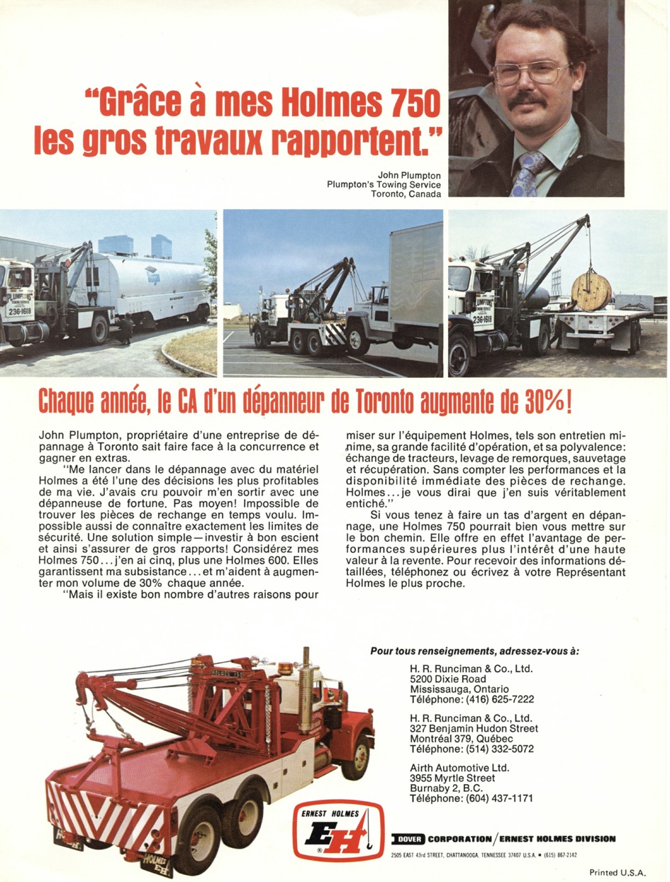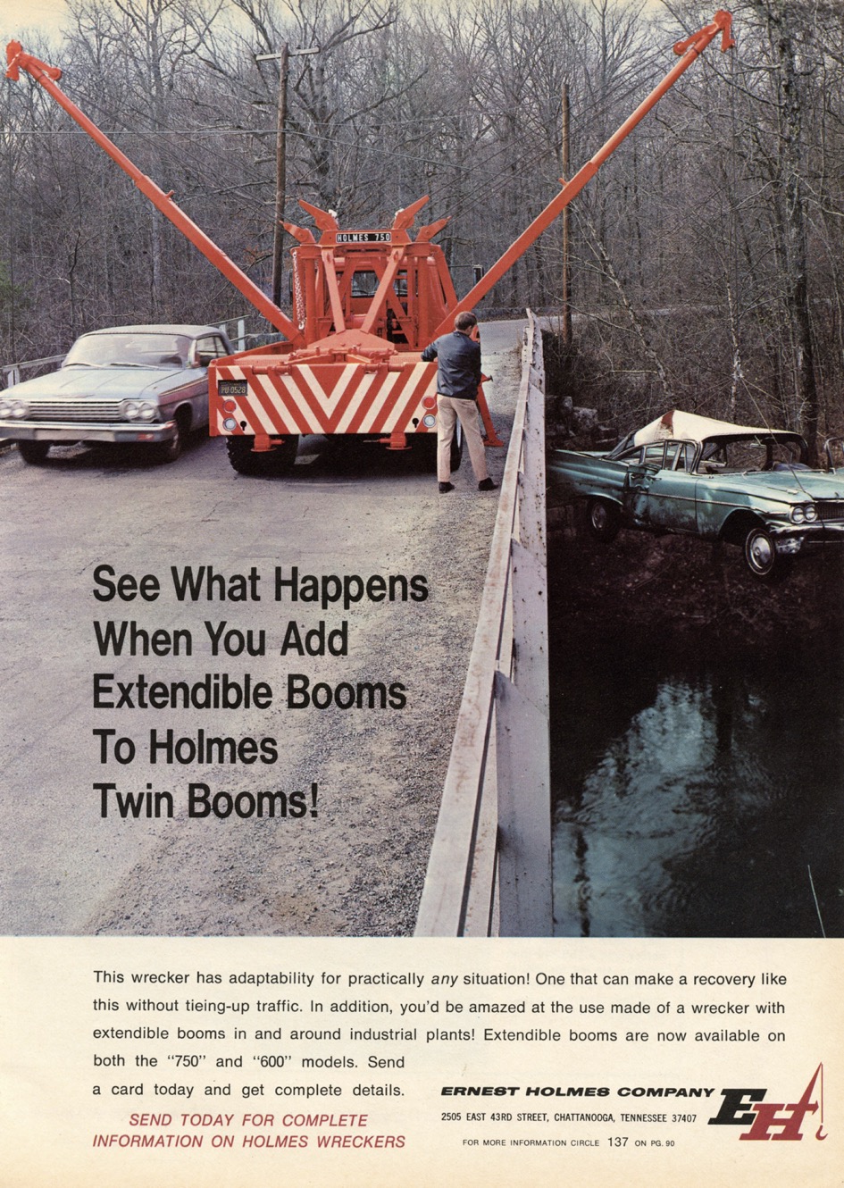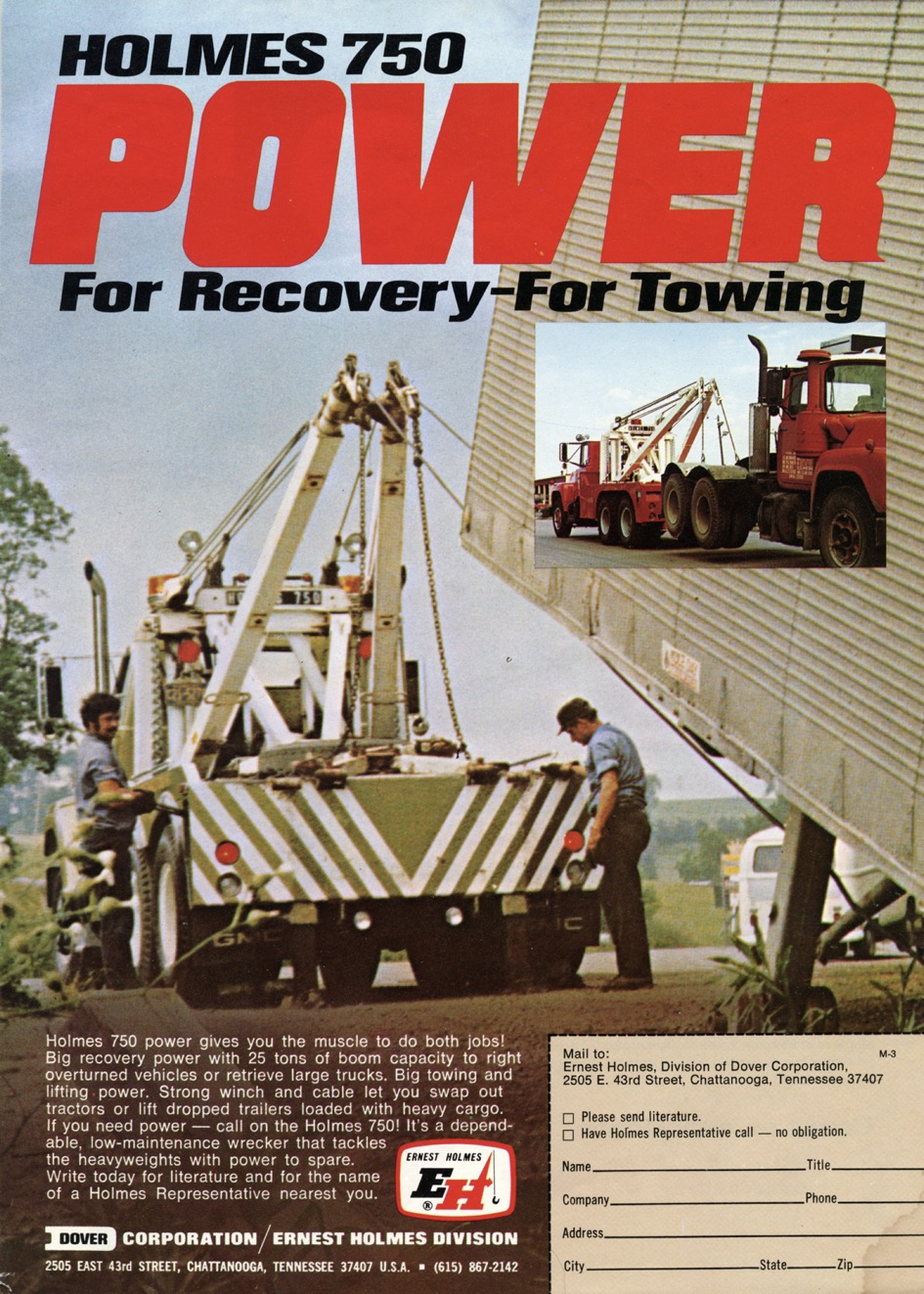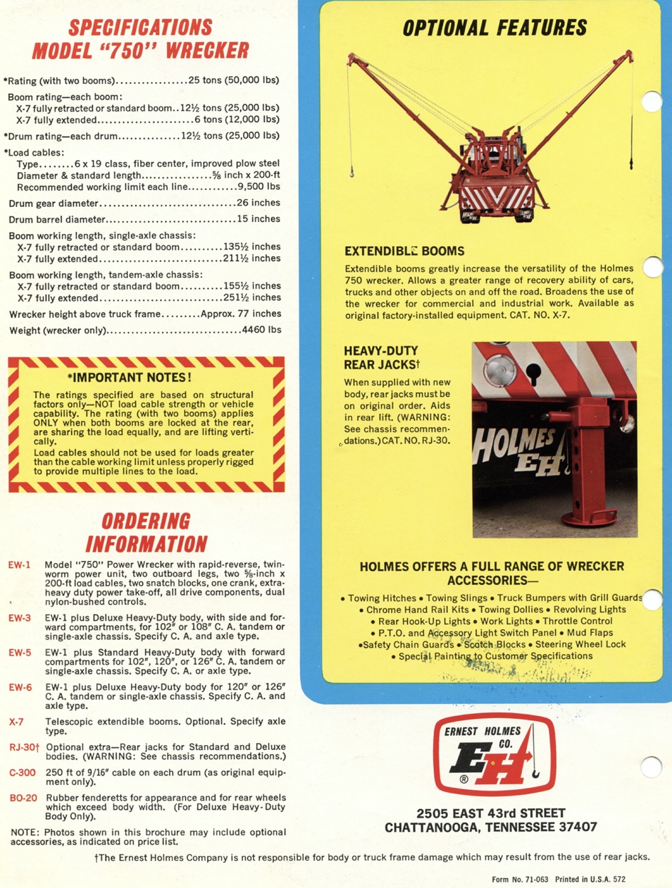 Holmes 750 The Holmes 750 25 Ton Twin Boom mechanical wrecker was targeted at medium and heavy duty towing and recovery. The first unit was shipped in September of 1962 and production continued until 1990: about 7000 units were built during a 28 year production run. Units were offered with standard or extending booms that could be specified in different lengths for single axle or tandem trucks. Outriggers were standard equipment and side mount controls were used on all versions. Deluxe bodies with toolboxes were available as was a durable military spec standard body. |