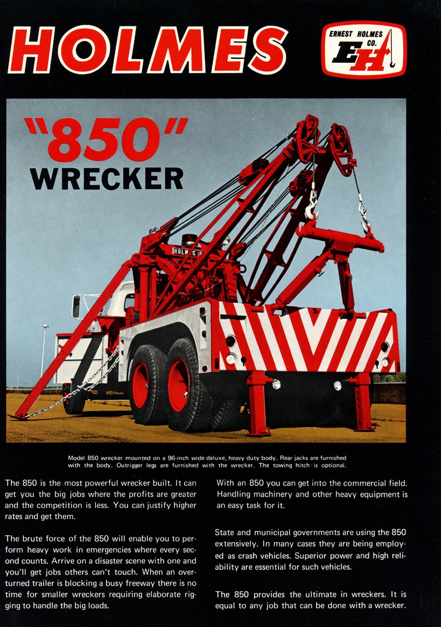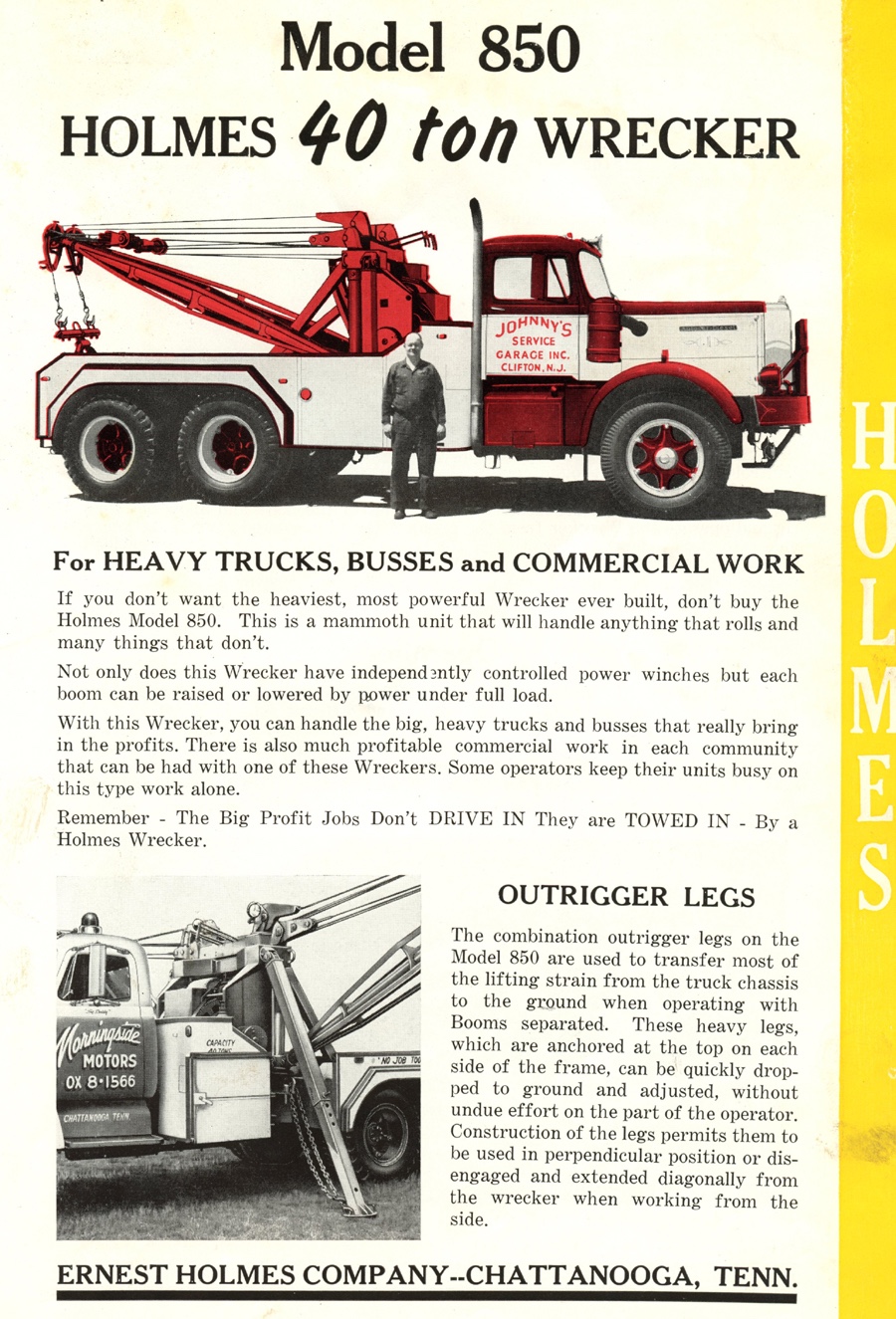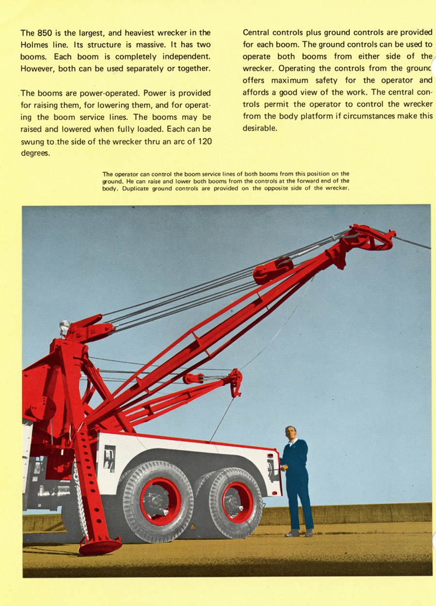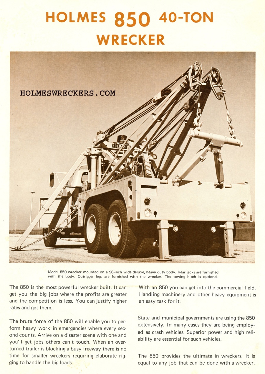 HOLMES 850 The Holmes 850 was the largest commercially produced mechanical wrecker Holmes offered. The first unit was shipped in March 1950 and by 1989 332 civilian units had been built. Serial Numbers on these units start at JB1– 104 (the early 850 code was “J”) and the last 850 I know of was shipped in October of 1989 – unit number 435 – making a total of 332 units built during 40 years of production (later 850 serial code was “RR”). Another 93 units were built for the US Marine Corp from June 1953 until June 1954. These can be identified by the serial plate number – from MI3 – 101 to MF3 – 194. Most 850’s were mounted on tandem trucks, but a few were supplied on single axle chassis. Unique among production Holmes Wreckers was the capability of lifting the booms under power and a 2 speed transmission for the winch line speed (6 ft / minute in low; 24 ft / minute high). Early units had the controls up on the deck right behind the winches: later units still had controls up on the deck but also had side controls so the operator did not have to climb up on the deck. Standard rating was 40 tons (early units were 35 ton) and each drum held 300 ft of ¾” cable so for most recoveries no cable extensions were required. Many of the Holmes 850 units are still in service as heavy recovery units – often mounted on the second or third chassis. One of the best known 850’s is the Jamie Davis truck “Big Mo” – star of the “Highway Thru Hell” television show. This 850 was purchased new in 1975 through Airth Automotive’s Cliff Airth by Garry Leach of Winnipeg’s United Towing. |