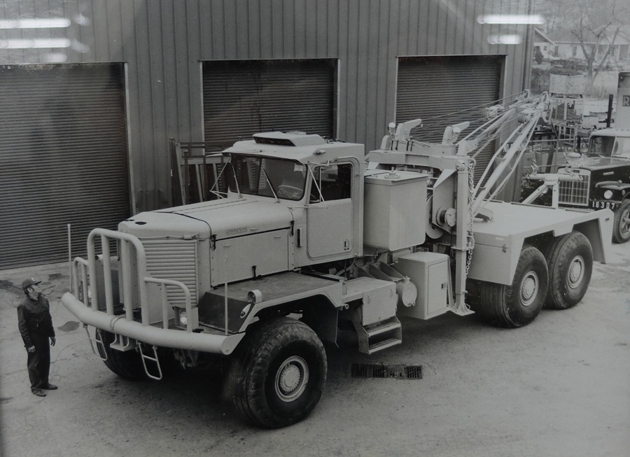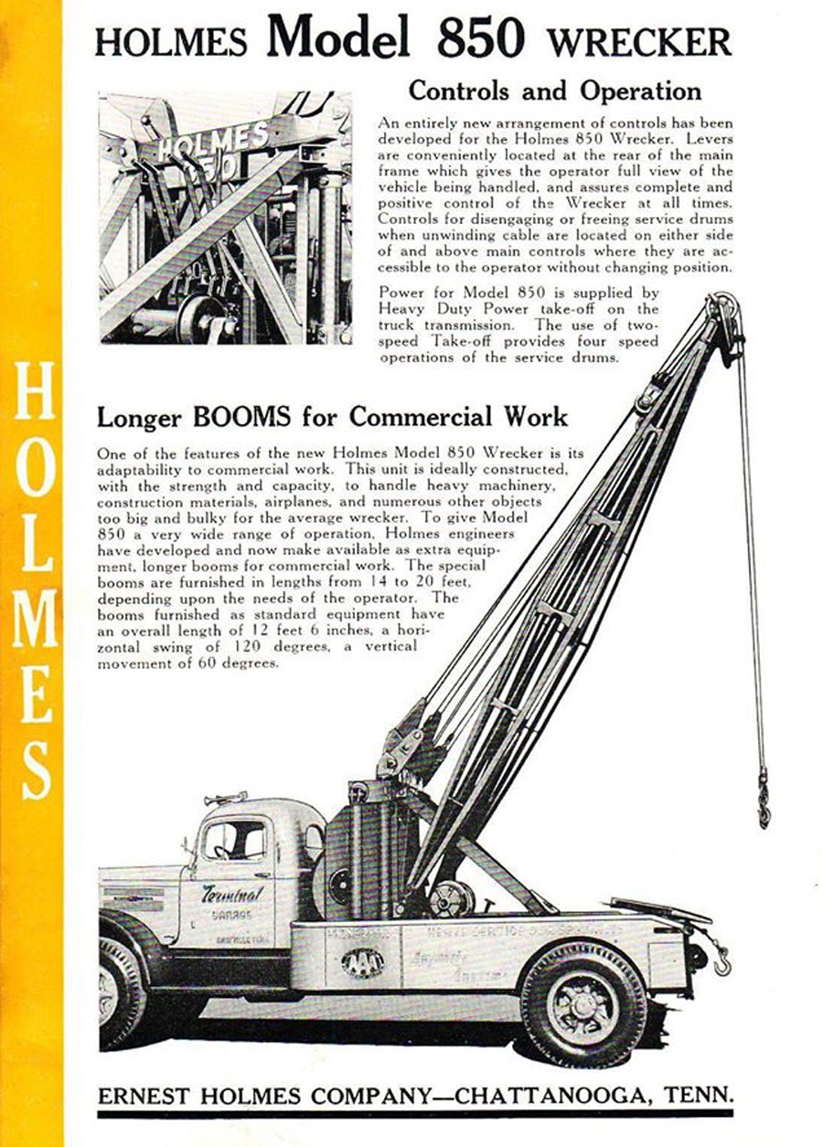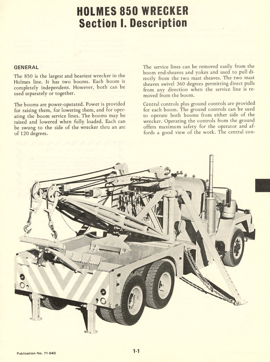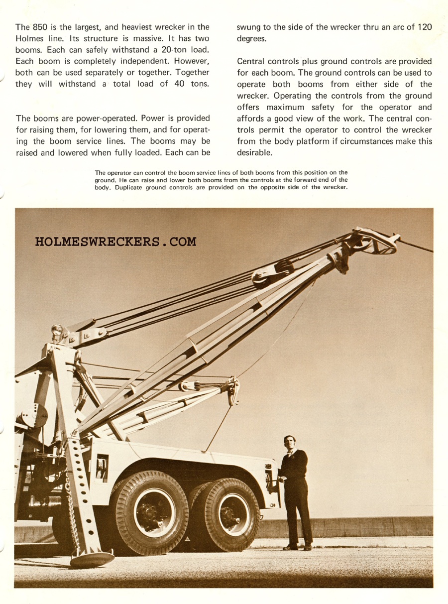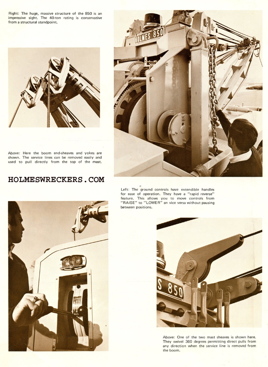 HOLMES 850 The Holmes 850 was the largest commercially produced mechanical wrecker Holmes offered. The first unit was shipped in March 1950 and by 1989 332 civilian units had been built. Serial Numbers on these units start at JB1– 104 (the early 850 code was “J”) and the last 850 I know of was shipped in October of 1989 – unit number 435 – making a total of 332 units built during 40 years of production (later 850 serial code was “RR”). Another 93 units were built for the US Marine Corp from June 1953 until June 1954. These can be identified by the serial plate number – from MI3 – 101 to MF3 – 194. Most 850’s were mounted on tandem trucks, but a few were supplied on single axle chassis. Unique among production Holmes Wreckers was the capability of lifting the booms under power and a 2 speed transmission for the winch line speed (6 ft / minute in low; 24 ft / minute high). Early units had the controls up on the deck right behind the winches: later units still had controls up on the deck but also had side controls so the operator did not have to climb up on the deck. Standard rating was 40 tons (early units were 35 ton) and each drum held 300 ft of ¾” cable so for most recoveries no cable extensions were required. Many of the Holmes 850 units are still in service as heavy recovery units – often mounted on the second or third chassis. One of the best known 850’s is the Jamie Davis truck “Big Mo” – star of the “Highway Thru Hell” television show. This 850 was purchased new in 1975 through Airth Automotive’s Cliff Airth by Garry Leach of Winnipeg’s United Towing. |