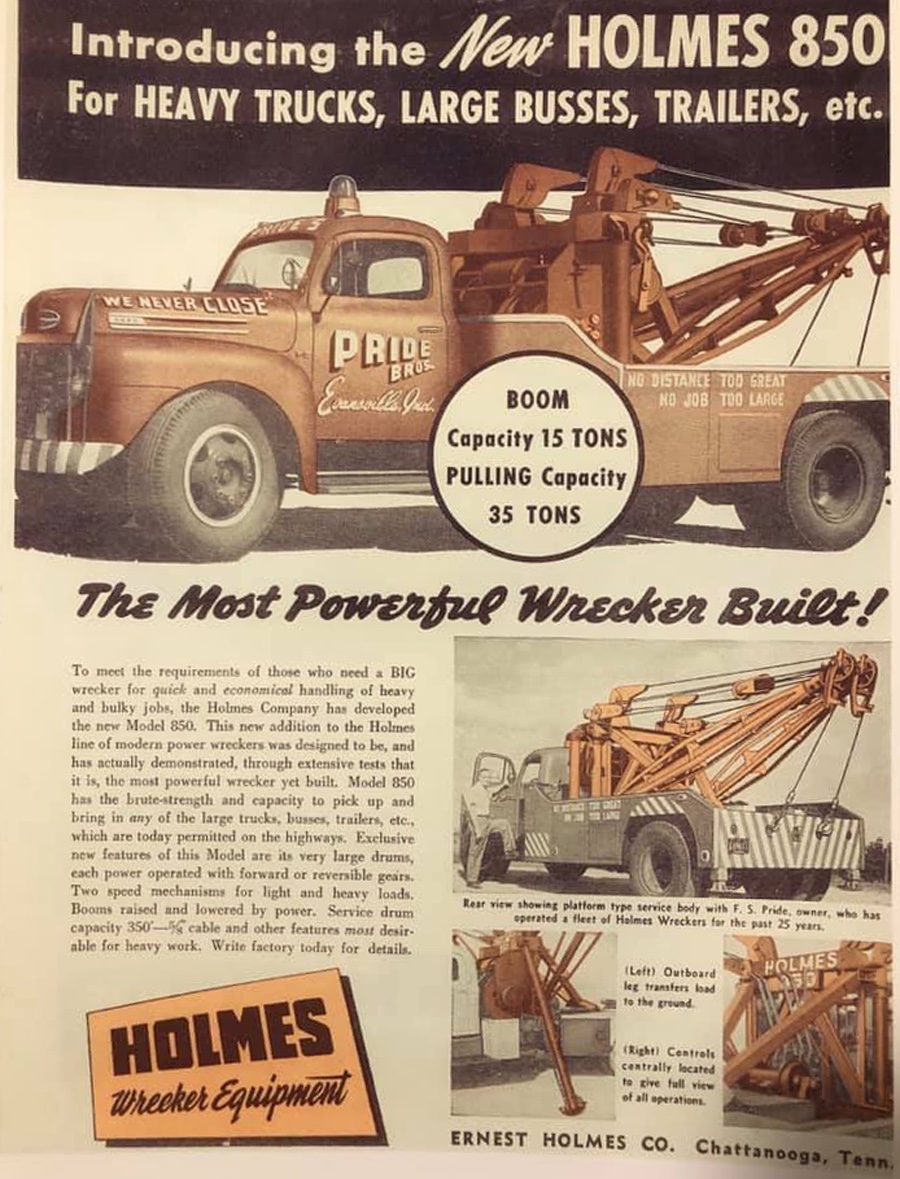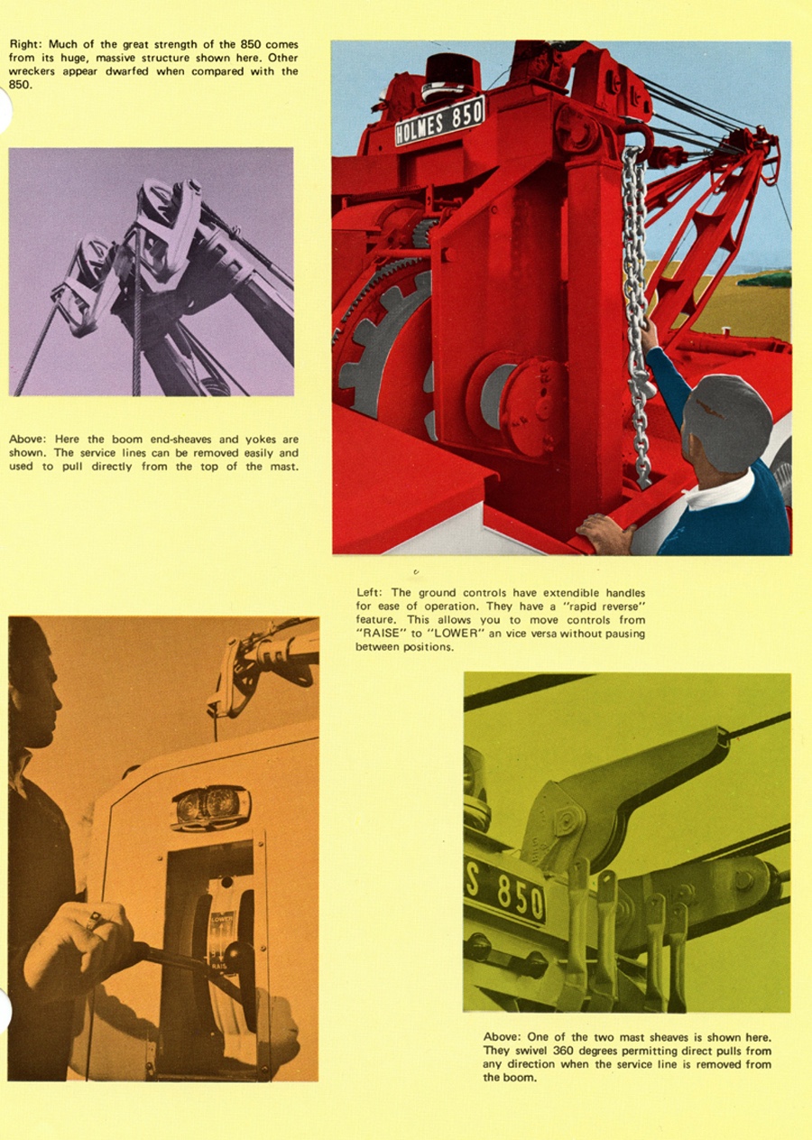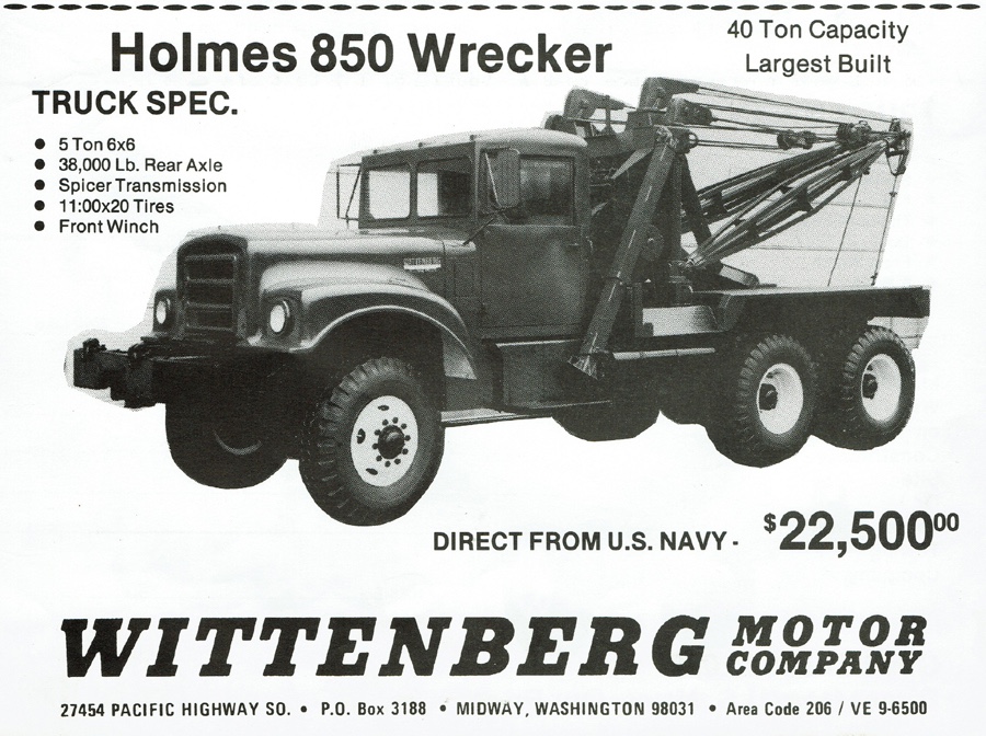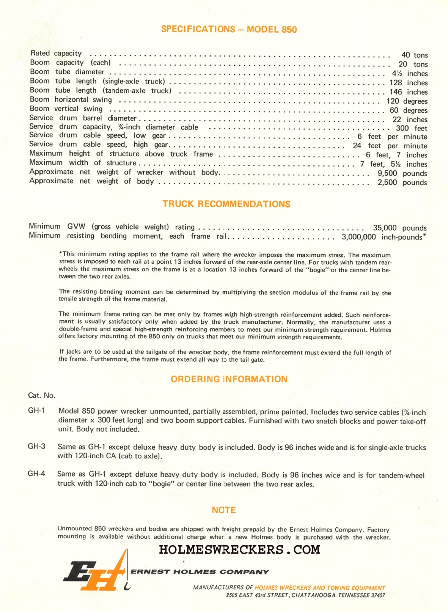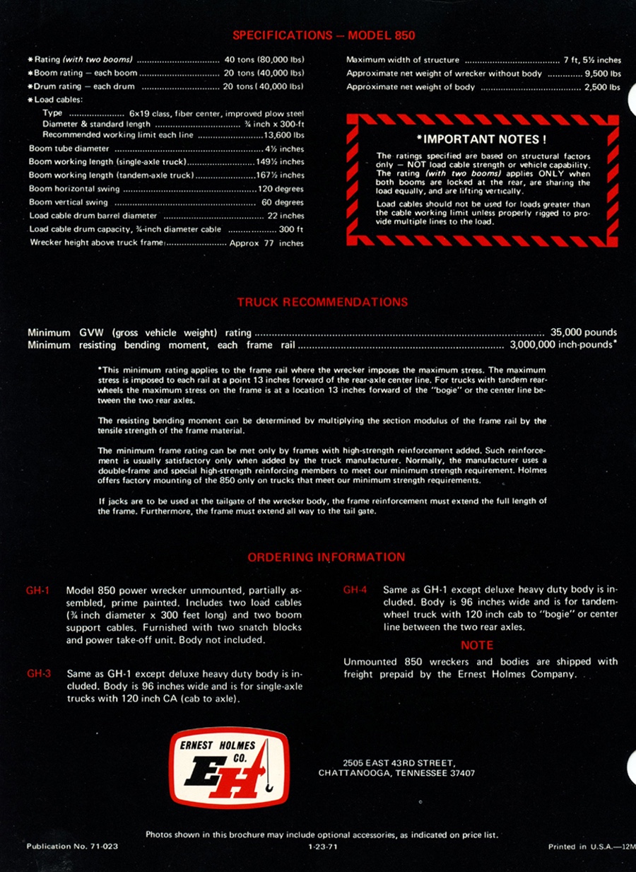 HOLMES 850 The Holmes 850 was the largest commercially produced mechanical wrecker Holmes offered. The first unit was shipped in March 1950 and by 1989 332 civilian units had been built. Serial Numbers on these units start at JB1– 104 (the early 850 code was “J”) and the last 850 I know of was shipped in October of 1989 – unit number 435 – making a total of 332 units built during 40 years of production (later 850 serial code was “RR”). Another 93 units were built for the US Marine Corp from June 1953 until June 1954. These can be identified by the serial plate number – from MI3 – 101 to MF3 – 194. Most 850’s were mounted on tandem trucks, but a few were supplied on single axle chassis. Unique among production Holmes Wreckers was the capability of lifting the booms under power and a 2 speed transmission for the winch line speed (6 ft / minute in low; 24 ft / minute high). Early units had the controls up on the deck right behind the winches: later units still had controls up on the deck but also had side controls so the operator did not have to climb up on the deck. Standard rating was 40 tons (early units were 35 ton) and each drum held 300 ft of ¾” cable so for most recoveries no cable extensions were required. Many of the Holmes 850 units are still in service as heavy recovery units – often mounted on the second or third chassis. One of the best known 850’s is the Jamie Davis truck “Big Mo” – star of the “Highway Thru Hell” television show. This 850 was purchased new in 1975 through Airth Automotive’s Cliff Airth by Garry Leach of Winnipeg’s United Towing. |