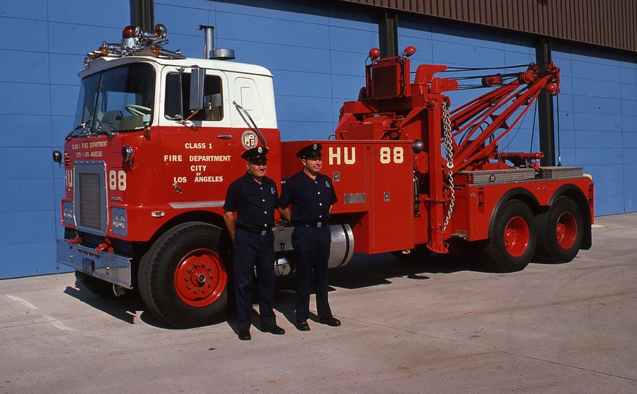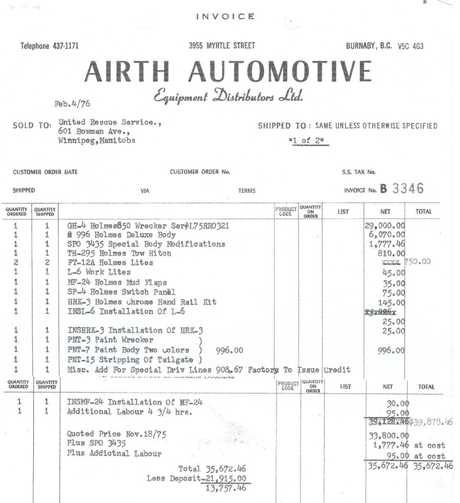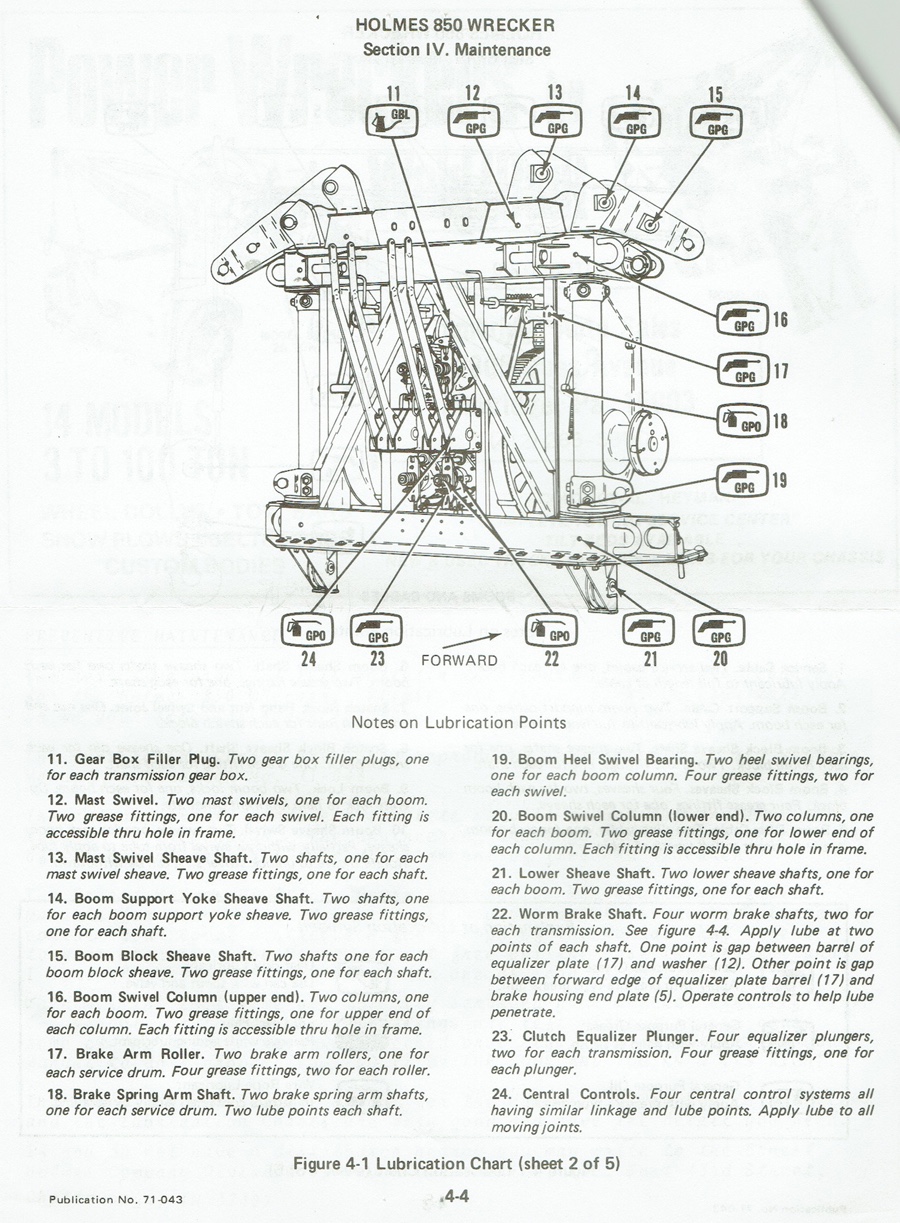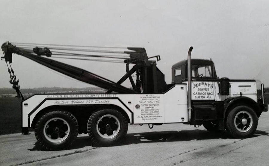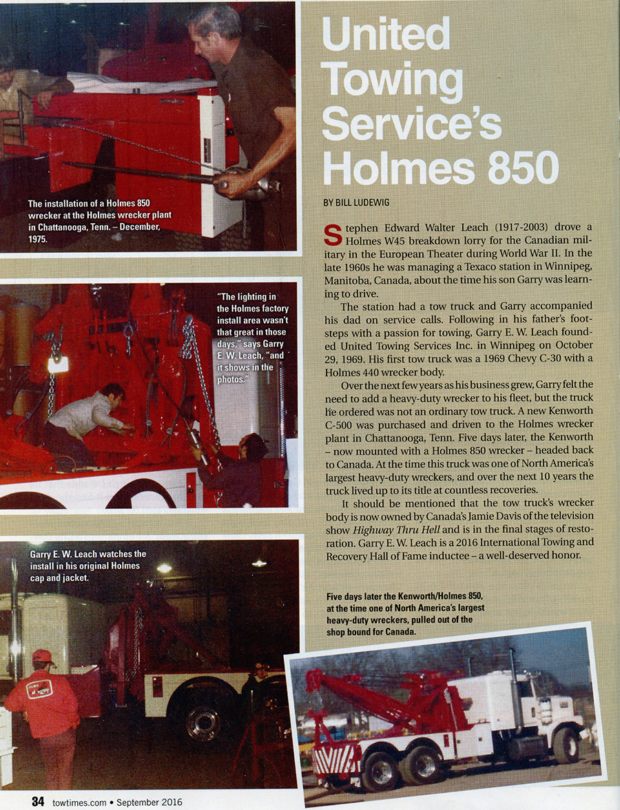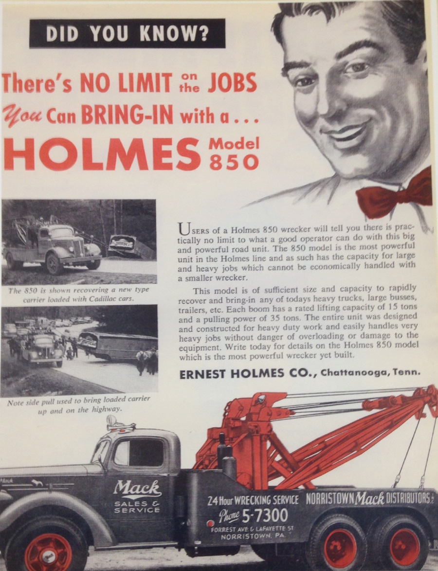 HOLMES 850 The Holmes 850 was the largest commercially produced mechanical wrecker Holmes offered. The first unit was shipped in March 1950 and by 1989 332 civilian units had been built. Serial Numbers on these units start at JB1– 104 (the early 850 code was “J”) and the last 850 I know of was shipped in October of 1989 – unit number 435 – making a total of 332 units built during 40 years of production (later 850 serial code was “RR”). Another 93 units were built for the US Marine Corp from June 1953 until June 1954. These can be identified by the serial plate number – from MI3 – 101 to MF3 – 194. Most 850’s were mounted on tandem trucks, but a few were supplied on single axle chassis. Unique among production Holmes Wreckers was the capability of lifting the booms under power and a 2 speed transmission for the winch line speed (6 ft / minute in low; 24 ft / minute high). Early units had the controls up on the deck right behind the winches: later units still had controls up on the deck but also had side controls so the operator did not have to climb up on the deck. Standard rating was 40 tons (early units were 35 ton) and each drum held 300 ft of ¾” cable so for most recoveries no cable extensions were required. Many of the Holmes 850 units are still in service as heavy recovery units – often mounted on the second or third chassis. One of the best known 850’s is the Jamie Davis truck “Big Mo” – star of the “Highway Thru Hell” television show. This 850 was purchased new in 1975 through Airth Automotive’s Cliff Airth by Garry Leach of Winnipeg’s United Towing. |