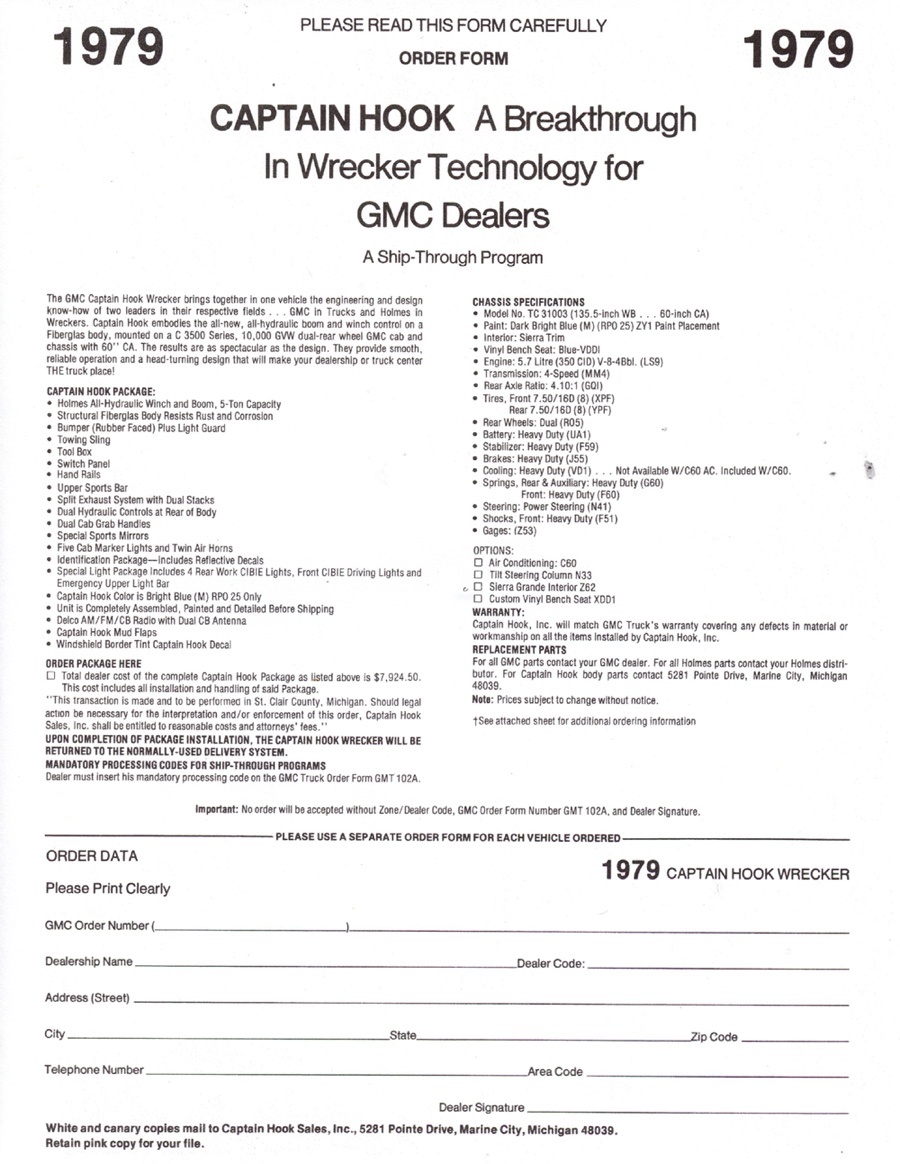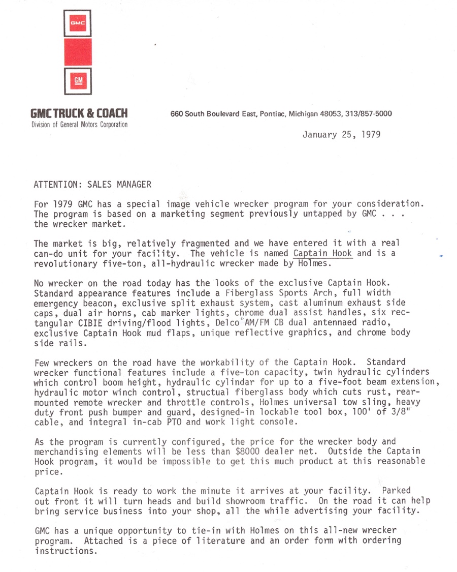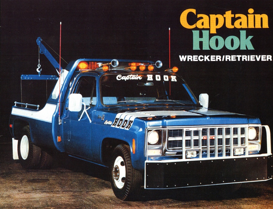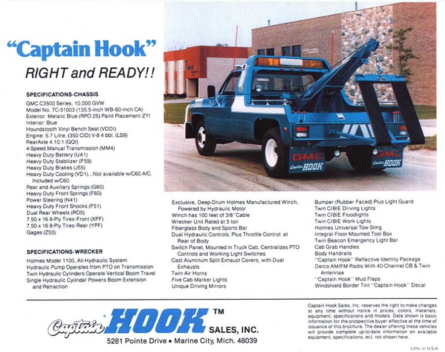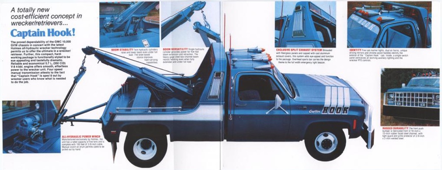 THE GMC “CAPTAIN HOOK” PROGRAM After Dodge worked with Nomar to market a factory dealer wrecker package in the 70’s GMC Truck decided in 1979 to move forward with a competitive offering organized by J.B. McLane, Sales Promotion Manager of GMC Truck in conjunction with Donald J Thornber of Marine City Michigan and Mark Body Co. of Mt Clemens, Michigan. The Captain Hook wrecker program was targeted for spring 1979. All units were to be built to the same spec; C3500 – 2WD with a 350 CID engine, 4 speed transmission in RPO 25 blue metallic paint. Only extra options permitted on the build sheet were air conditioning, tilt wheel, Z82 Sierra Grande and custom vinyl seat. The chassis was then shipped from the Pontiac, Michigan GMC plant direct to the Captain Hook operations in Marine City, Michigan. The Holmes 1100 crane and fiberglass sports body was shipped from Holmes in Chattanooga to Mark Body Co, Mt Clemens, Michigan for paint and installation. The custom “Captain Hook” additions include the raised twin sonic light bar cover, cast aluminum dual exhaust outlets in the sport bar, custom paint and striping, “Captain Hook” mud flaps and a special lighting package. The completed units were then shipped to the selling dealer. We do not have a record of how many were sold – estimates range from 100-200 trucks but very few have survived – we only know of one that is completely original and this was on display at the Baltimore Tow Show in 2021. Most of the other units have been installed on replacement chassis, but can be identified by the raised light bar and the exhaust outlets in the sport bar. Also the serial plate on the Holmes body will have a model number of 407CH (the CH is for Captain Hook). The package also attracted the attention of Revell who made quite an accurate model of the package: these are still available on Ebay. Several of the “Captain Hook” packages were also used on the television show “ CHIPS ”. We are recording the serial numbers of all the “Captain Hook” packages that turn up: please contact us if you still have one – or have pictures of the trucks from 40 years ago. |