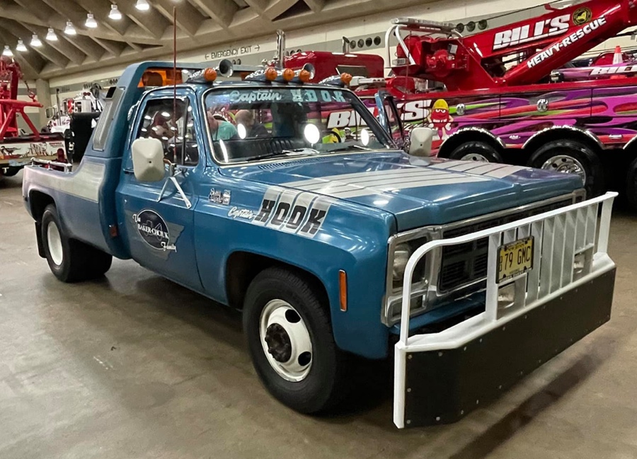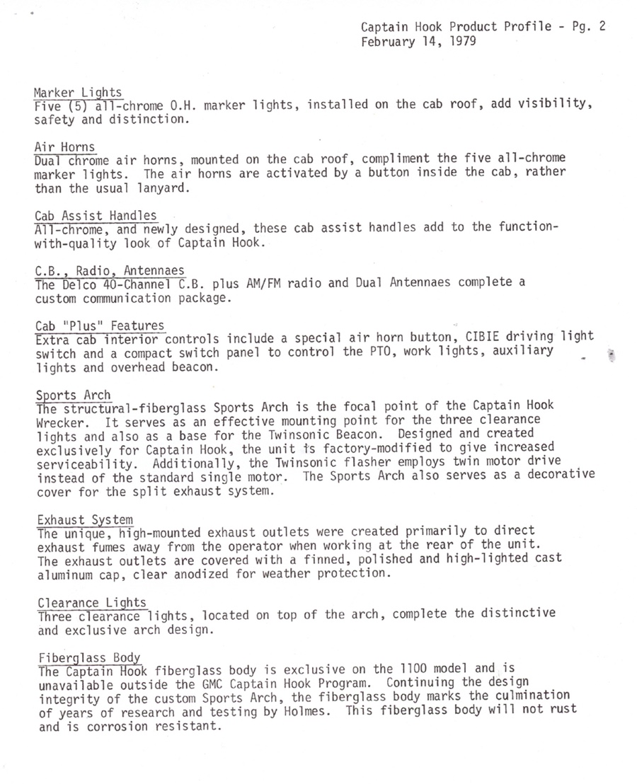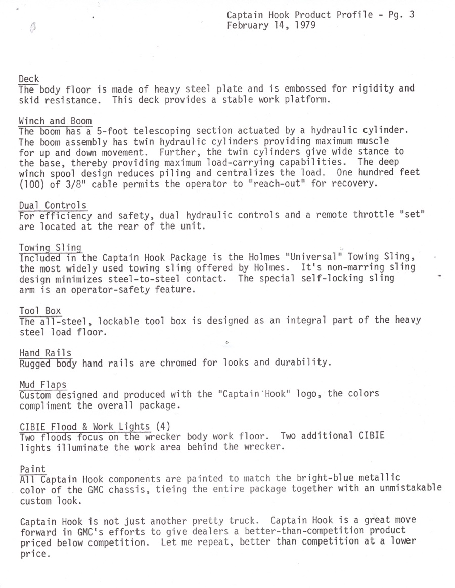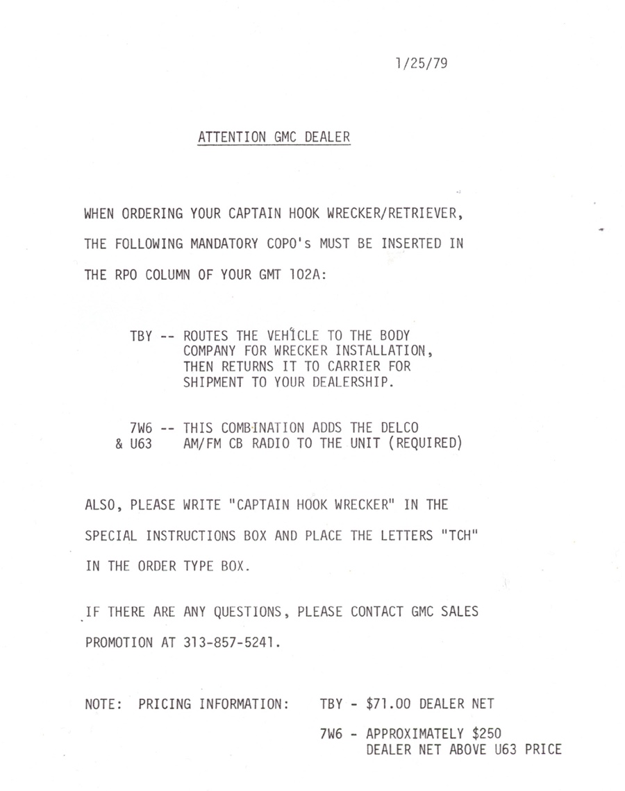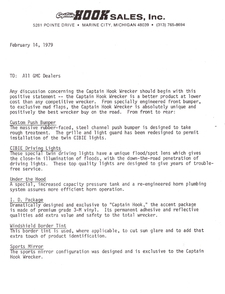 THE GMC “CAPTAIN HOOK” PROGRAM After Dodge worked with Nomar to market a factory dealer wrecker package in the 70’s GMC Truck decided in 1979 to move forward with a competitive offering organized by J.B. McLane, Sales Promotion Manager of GMC Truck in conjunction with Donald J Thornber of Marine City Michigan and Mark Body Co. of Mt Clemens, Michigan. The Captain Hook wrecker program was targeted for spring 1979. All units were to be built to the same spec; C3500 – 2WD with a 350 CID engine, 4 speed transmission in RPO 25 blue metallic paint. Only extra options permitted on the build sheet were air conditioning, tilt wheel, Z82 Sierra Grande and custom vinyl seat. The chassis was then shipped from the Pontiac, Michigan GMC plant direct to the Captain Hook operations in Marine City, Michigan. The Holmes 1100 crane and fiberglass sports body was shipped from Holmes in Chattanooga to Mark Body Co, Mt Clemens, Michigan for paint and installation. The custom “Captain Hook” additions include the raised twin sonic light bar cover, cast aluminum dual exhaust outlets in the sport bar, custom paint and striping, “Captain Hook” mud flaps and a special lighting package. The completed units were then shipped to the selling dealer. We do not have a record of how many were sold – estimates range from 100-200 trucks but very few have survived – we only know of one that is completely original and this was on display at the Baltimore Tow Show in 2021. Most of the other units have been installed on replacement chassis, but can be identified by the raised light bar and the exhaust outlets in the sport bar. Also the serial plate on the Holmes body will have a model number of 407CH (the CH is for Captain Hook). The package also attracted the attention of Revell who made quite an accurate model of the package: these are still available on Ebay. Several of the “Captain Hook” packages were also used on the television show “ CHIPS ”. We are recording the serial numbers of all the “Captain Hook” packages that turn up: please contact us if you still have one – or have pictures of the trucks from 40 years ago. |