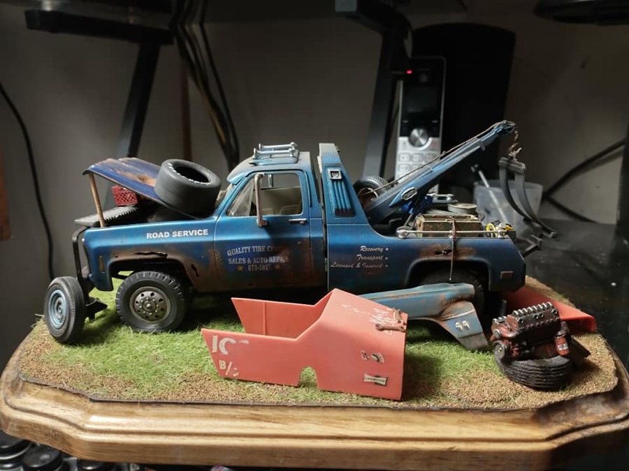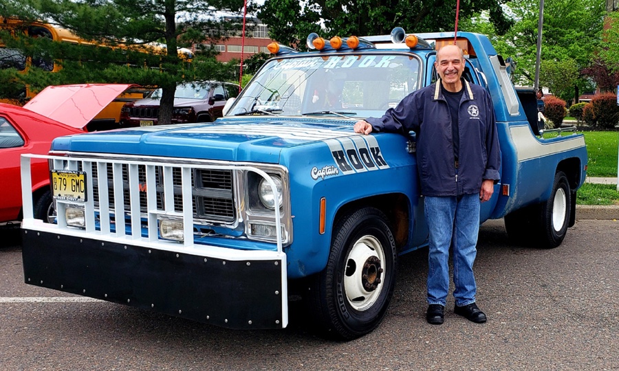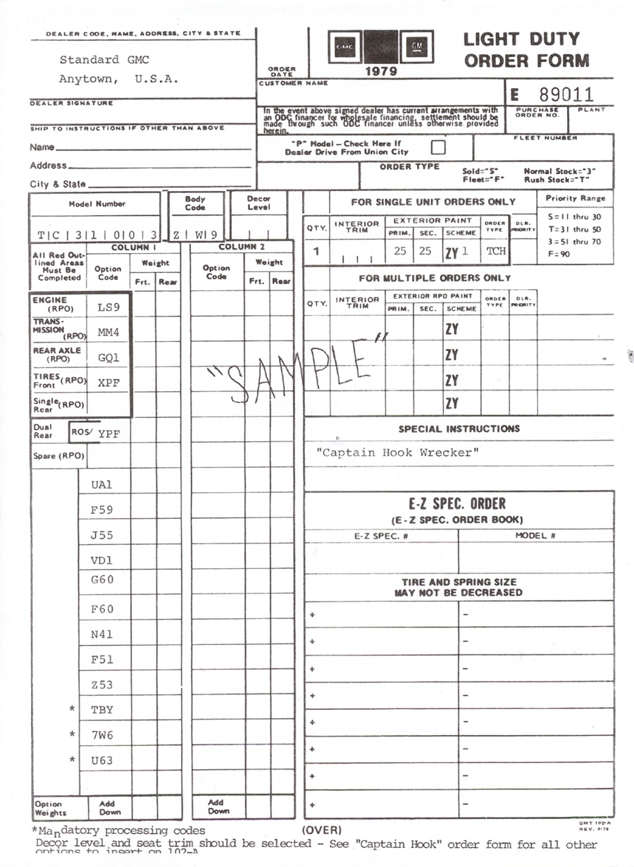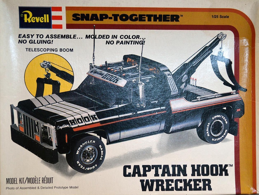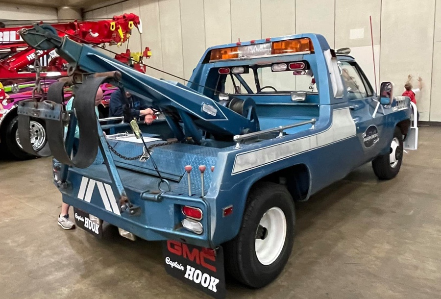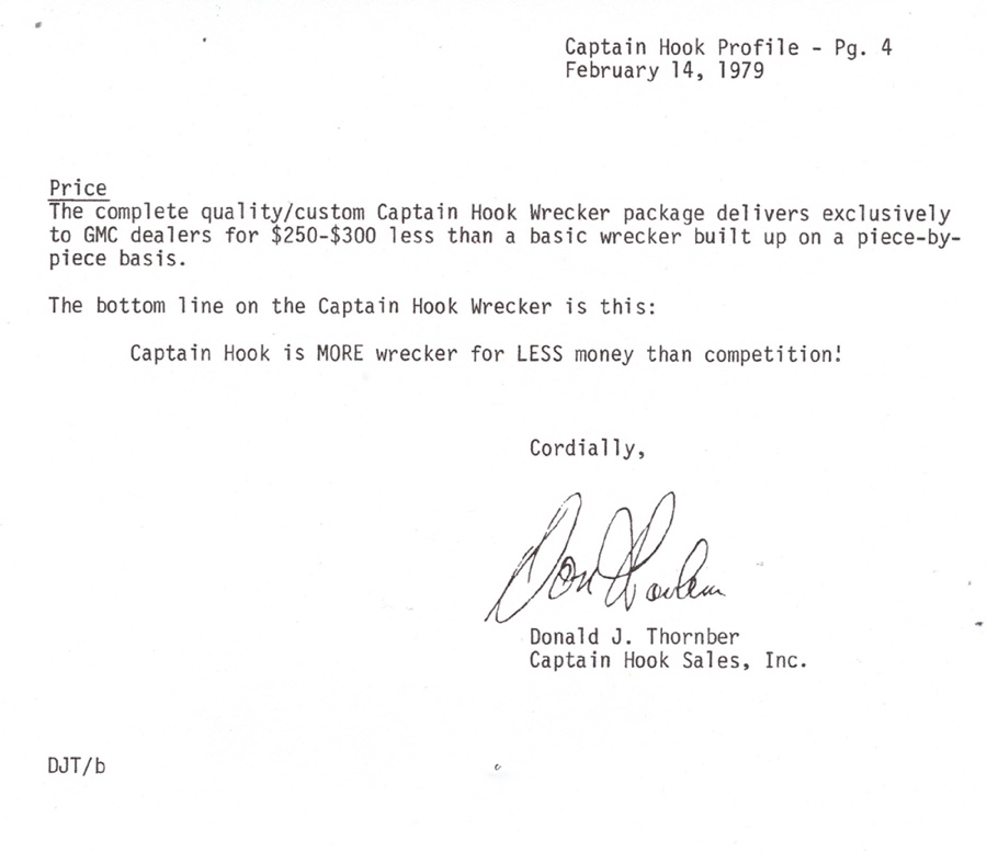THE GMC “CAPTAIN HOOK” PROGRAM After Dodge worked with Nomar to market a factory dealer wrecker package in the 70’s GMC Truck decided in 1979 to move forward with a competitive offering organized by J.B. McLane, Sales Promotion Manager of GMC Truck in conjunction with Donald J Thornber of Marine City Michigan and Mark Body Co. of Mt Clemens, Michigan. The Captain Hook wrecker program was targeted for spring 1979. All units were to be built to the same spec; C3500 – 2WD with a 350 CID engine, 4 speed transmission in RPO 25 blue metallic paint. Only extra options permitted on the build sheet were air conditioning, tilt wheel, Z82 Sierra Grande and custom vinyl seat. The chassis was then shipped from the Pontiac, Michigan GMC plant direct to the Captain Hook operations in Marine City, Michigan. The Holmes 1100 crane and fiberglass sports body was shipped from Holmes in Chattanooga to Mark Body Co, Mt Clemens, Michigan for paint and installation. The custom “Captain Hook” additions include the raised twin sonic light bar cover, cast aluminum dual exhaust outlets in the sport bar, custom paint and striping, “Captain Hook” mud flaps and a special lighting package. The completed units were then shipped to the selling dealer. We do not have a record of how many were sold – estimates range from 100-200 trucks but very few have survived – we only know of one that is completely original and this was on display at the Baltimore Tow Show in 2021. Most of the other units have been installed on replacement chassis, but can be identified by the raised light bar and the exhaust outlets in the sport bar. Also the serial plate on the Holmes body will have a model number of 407CH (the CH is for Captain Hook). The package also attracted the attention of Revell who made quite an accurate model of the package: these are still available on Ebay. Several of the “Captain Hook” packages were also used on the television show “ CHIPS ”. We are recording the serial numbers of all the “Captain Hook” packages that turn up: please contact us if you still have one – or have pictures of the trucks from 40 years ago. |